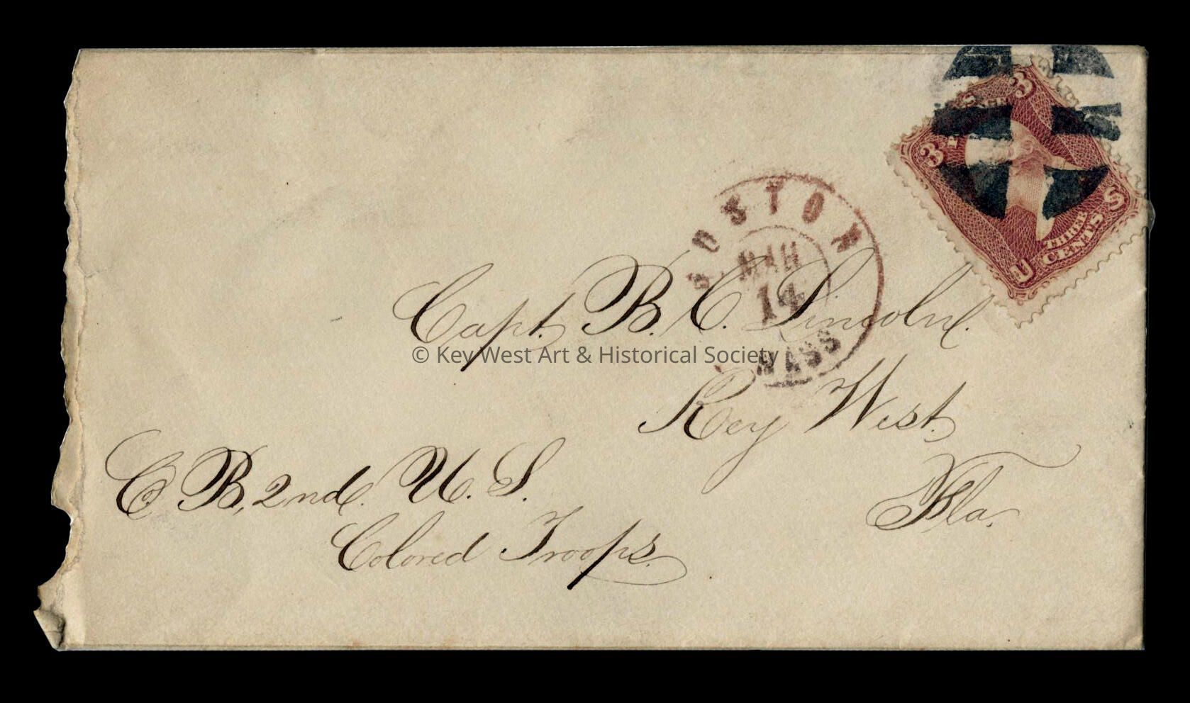 An envelope addressed to Benjamin C. Lincoln, of the 2nd U.S. Infantry (Colored) while he was stationed in Key West.  A fervent patriot and devout Christian, Benjamin Lincoln's strong abolitionist beliefs led him to take a commission with the 2nd U.S. Infantry (Colored).Collection