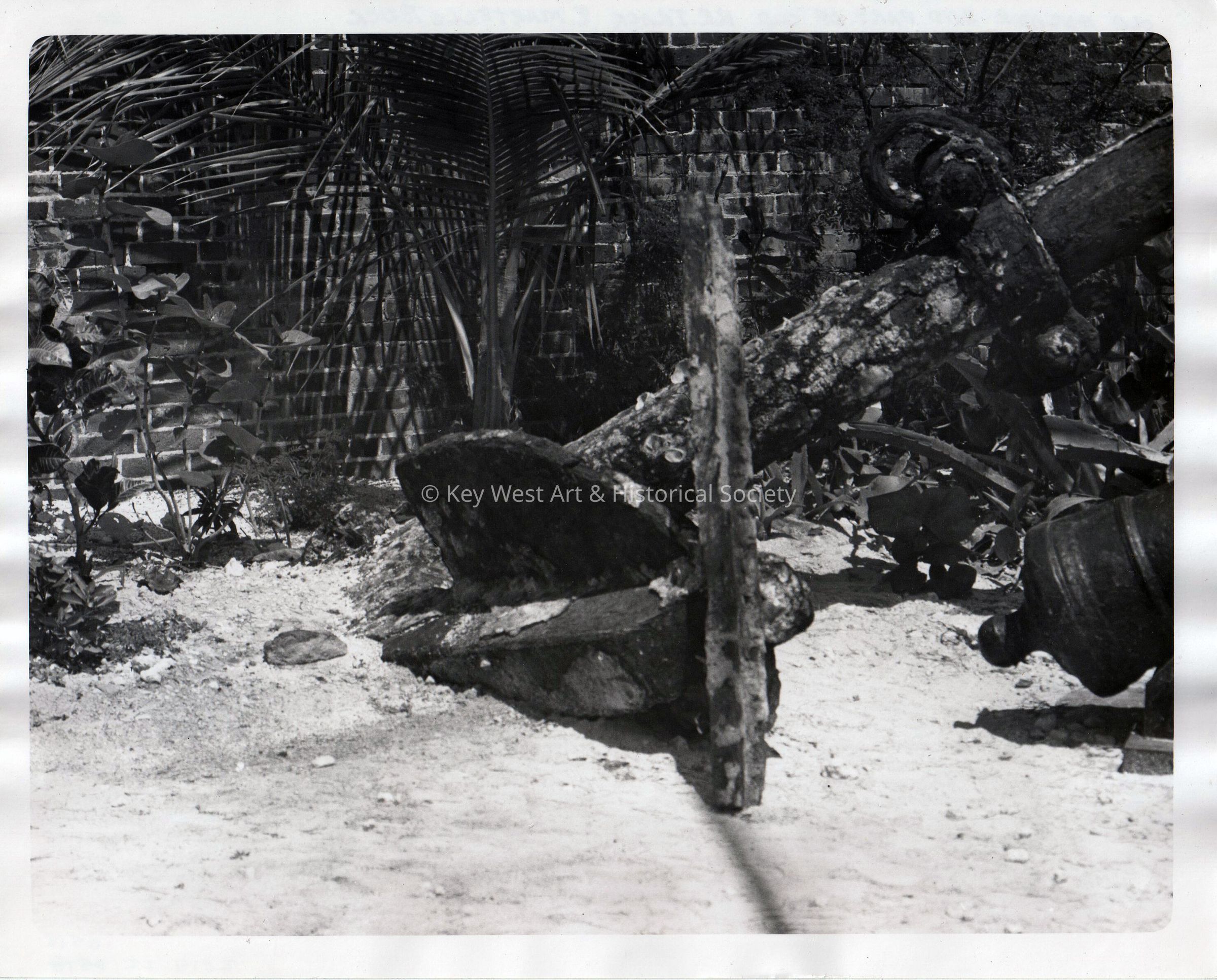 Black and white photograph of a portion of an anchor and cannon outside of Fort East Martello Museum.