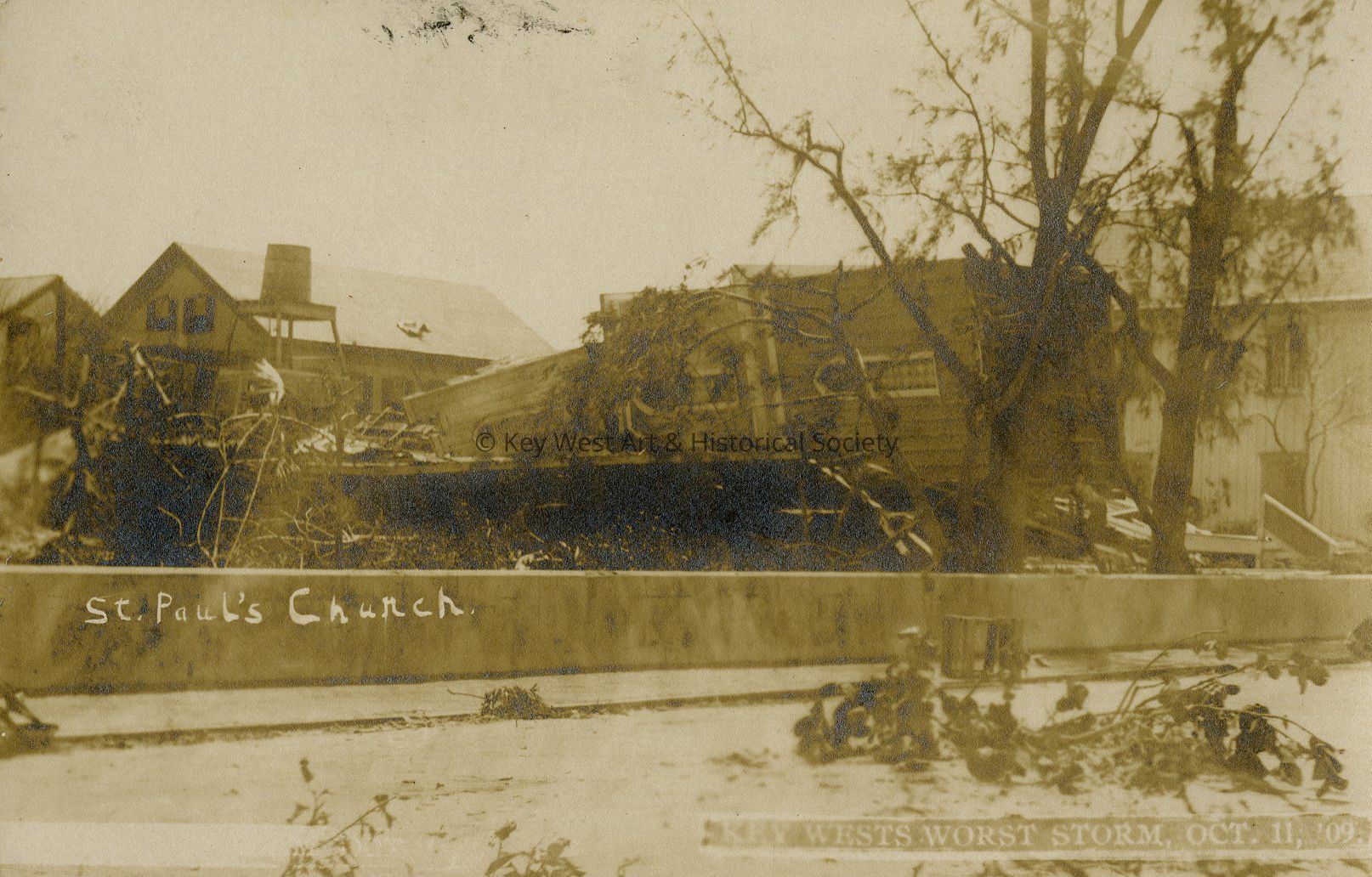 Photograph postcard depicting the destruction at St. Paul's Episcopal Church on Duval Street as a result of the 1909 Hurricane.