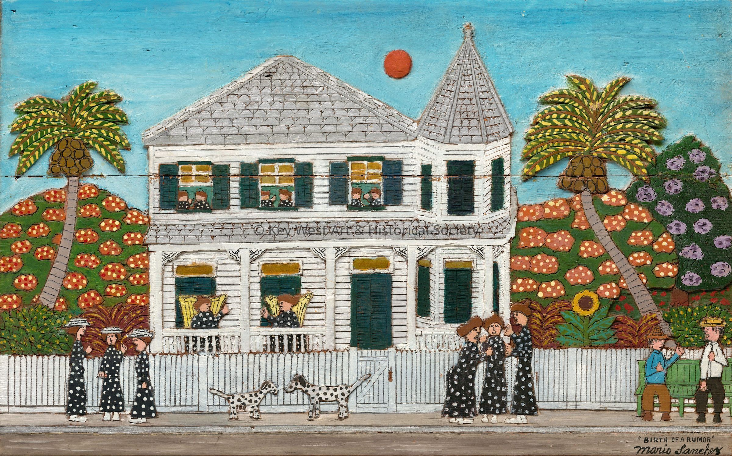Wood carving by Mario Sanchez depicting groups of women standing in black dresses with white polka dots gossiping in front of a turreted white conch house.  Two Dalmatian dogs are also on the sidewalk along with two men talking on a bench.