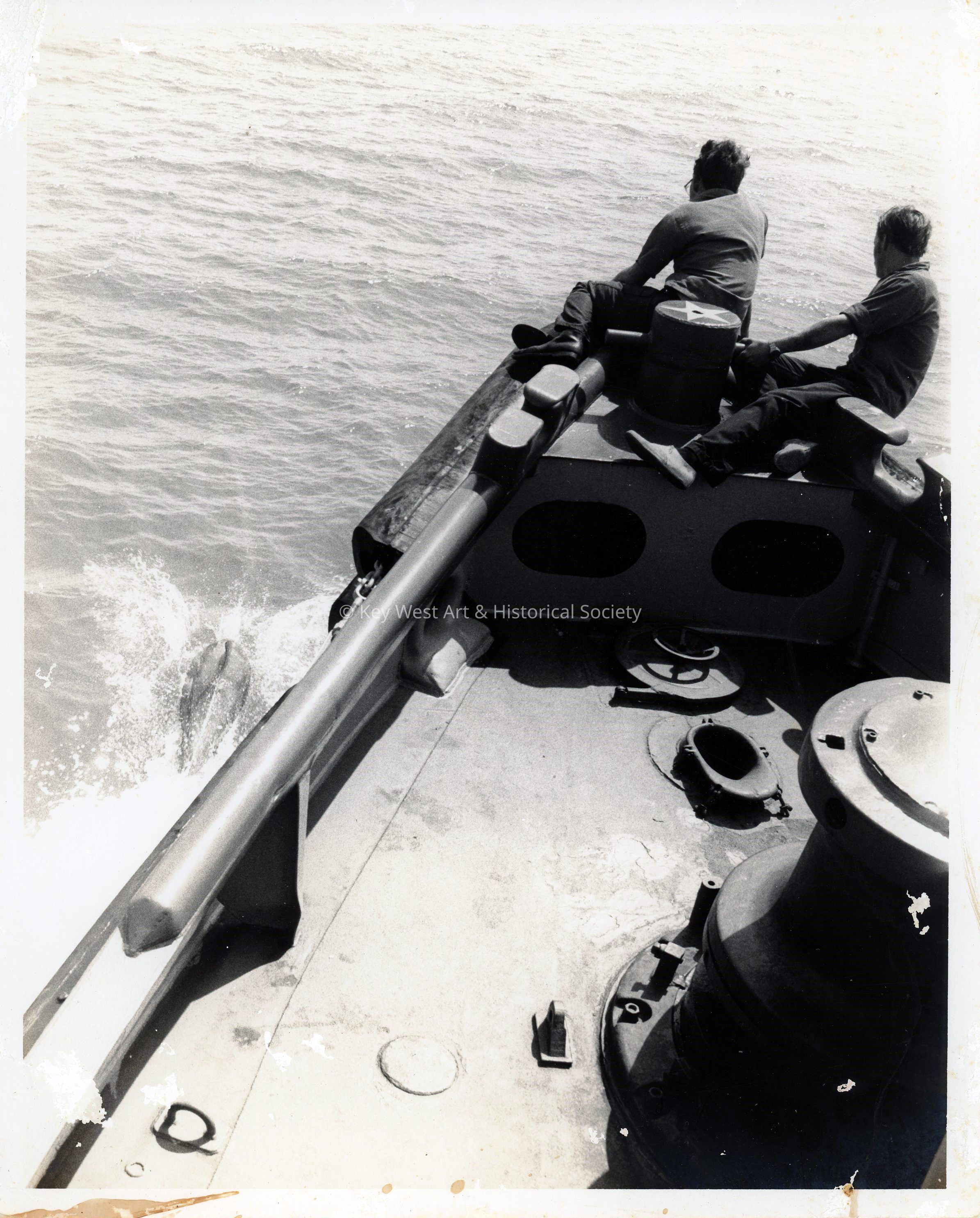 Black and white photograph of two US Navy sailors on the bow of a ship taking a load of Key West car wrecks to dump in the ocean. They watch a dolphin swimming off the port side of the vessel.