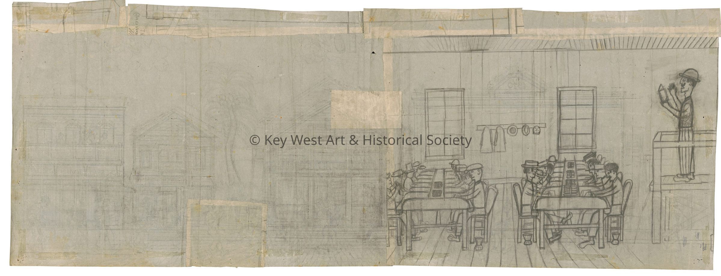 Paper bag drawing by Mario Sanchez depicting a bustling street scene of Comparsa dancers lined down the 600 block of Duval Street in front of Diamandi's Good Year Shoe Shop, Dewey Riggs Cigar Shop, a gift shop, Estevez's photo Studio, and Frank Johnson Jeweler. Matches intaglio 1987.01.3236.Type of Drawing
