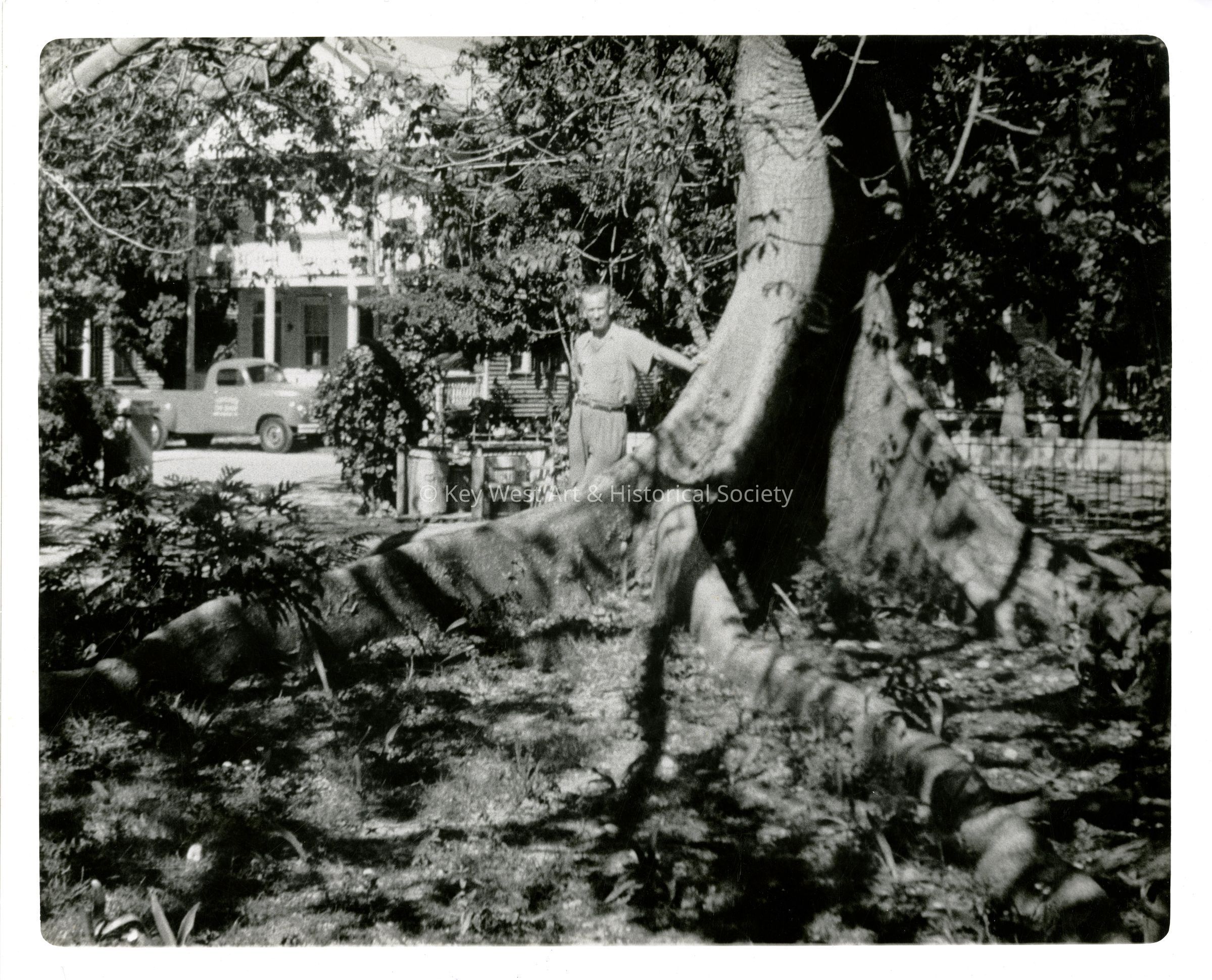 Black and white photograph of an unknown man standing at the base of a Kapok Tree in a Key West yard.