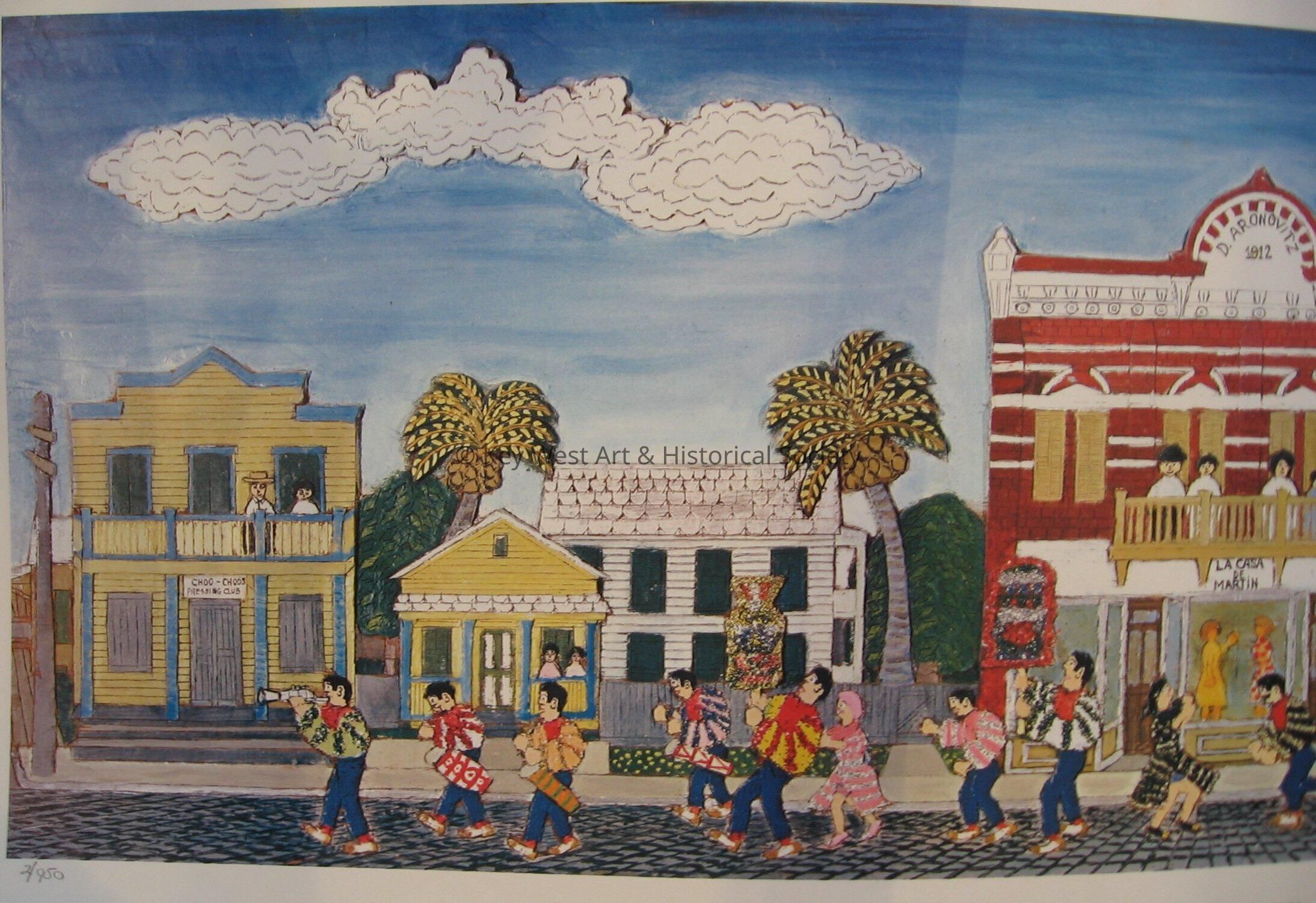 Colored print, signed and stamped, and numbered 2 of 950.  Street scene of comparsa dancers moving down the street in front of Choo-Choos Pressing Club, La Casa de Martin, Southernmost Flowers, and Beachcomber Jewelers.Collection