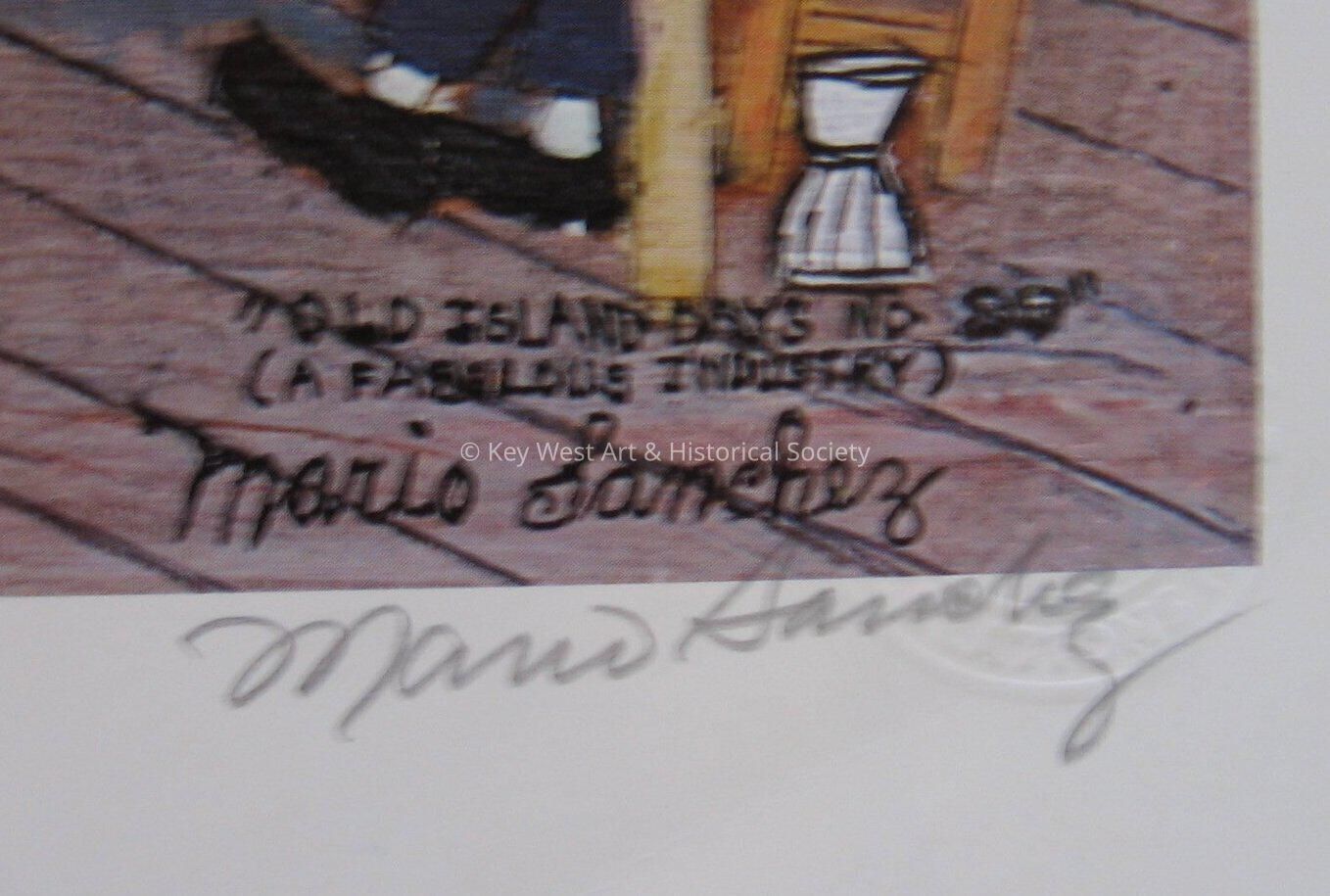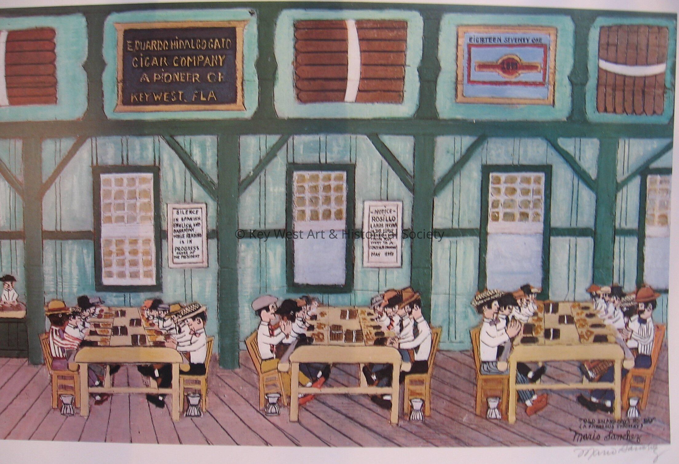 Signed and numbered print by Mario Sanchez. Numbered 2/950. Scene of Eduardo Hidalgo Gato Cigar Company. Workers are sitting at tables rolling cigars, on the left four people are sitting at barrels peeling cigar leaves, and a man is standing on a platform reading from a paper to the workers. Print is from Old Island Days #99 A Fabulous Industry 1987.01.3209Type of Print