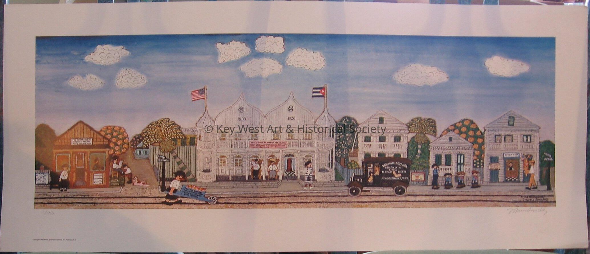 Colored print, stamped and signed, numbered 2 of 950. Street scene of Duval between Amelia and Virginia. Tom the Boatman is pushing a wheel barrel of yellowtails and snapper down the road, a truck for triumph coffee mill is driving down the street. The Waterloo Café, Cuban Club, and Botica Cuba are all in the background. Copied from My Old Neighborhood 1987.01.3204Collection