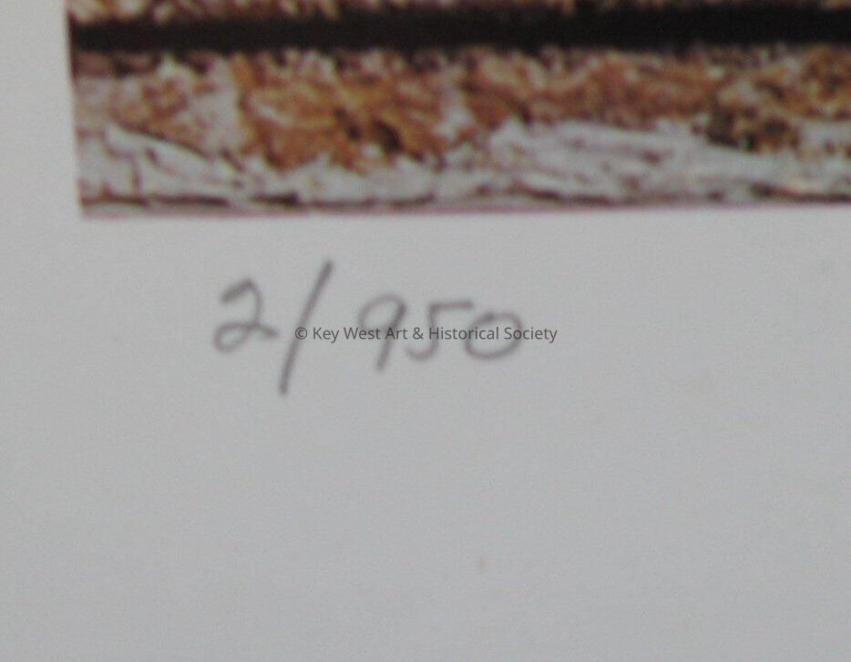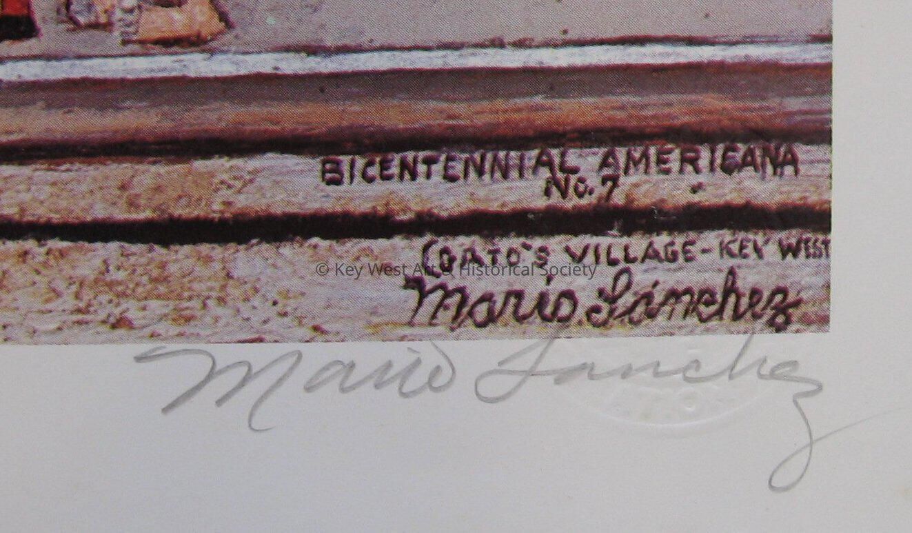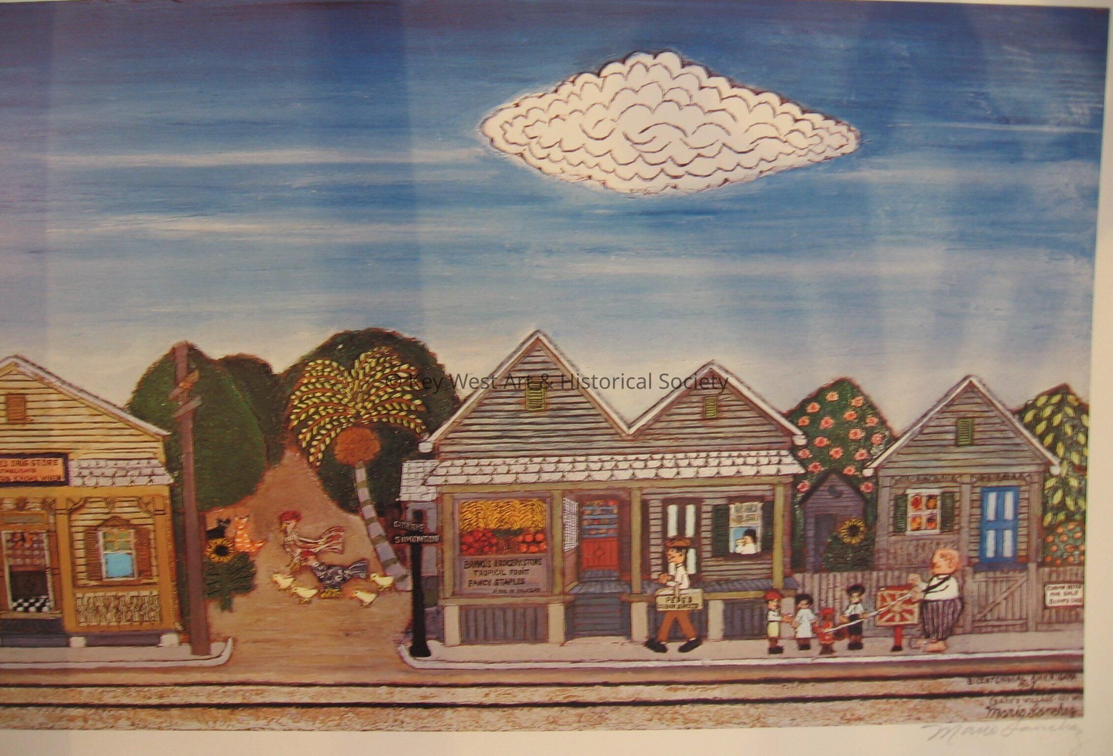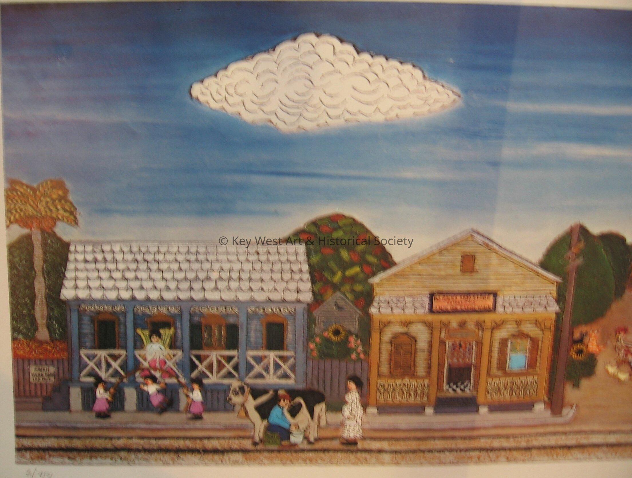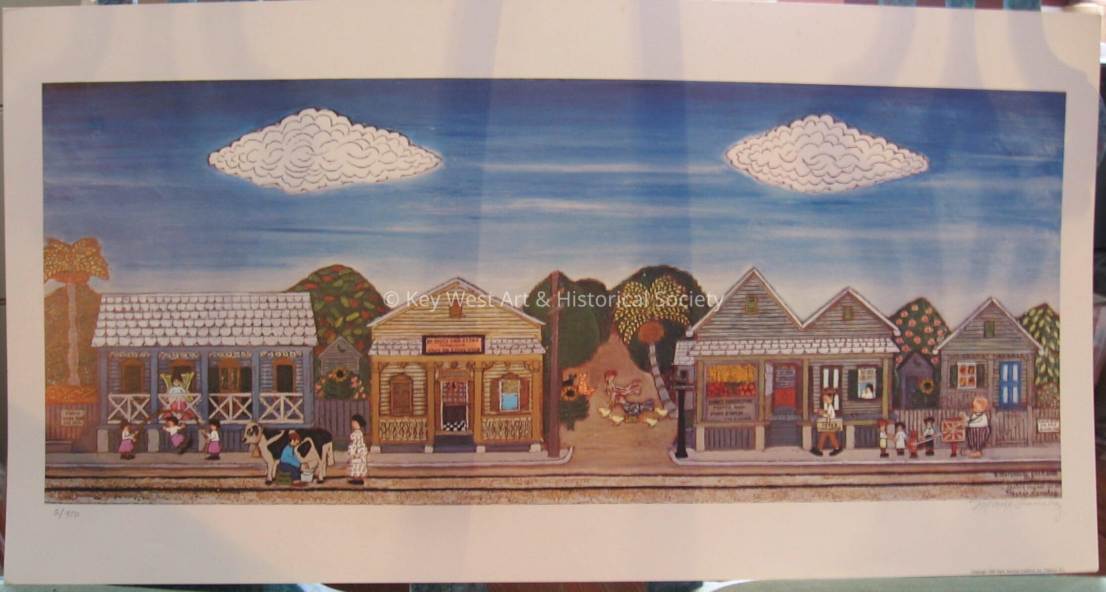Colored print, signed and stamped, numbered 2 of 950. Street scene of Simonton and Catherine. Girls are jumping rope on the sidewalk, a man is milking a cow for a lady, and children are watching the monkey man. Dr. Busto's Drug Store and Bravo's Grocery Store are in the background. Copied from Bicentennial Americana #7 1987.01.3208.Collection