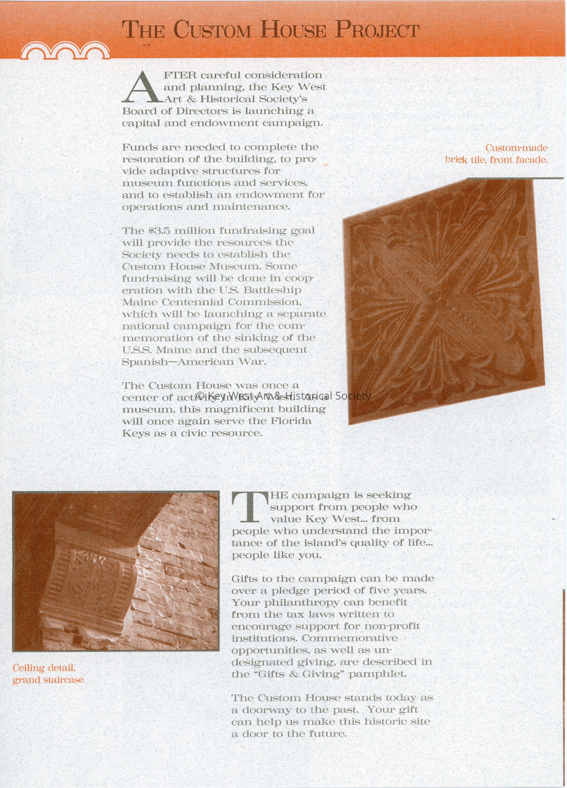 An informational pamphlet detailing the work Key West Art & Historical Society has done to preserve history and serve the community in Key West. It also includes the history of the Custom House and how the Society plans to utilize the property once it is opened. The pamphlet was made as part of a capital and endowment campaign for the restoration and preservation of the Custom House.Collection