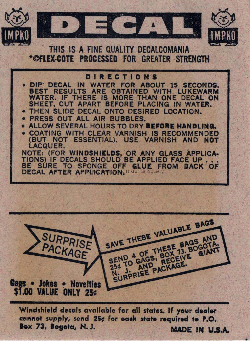 Instructions that accompanied the travel decal created by the Impko company depicting an aerial view of Key West.Collection