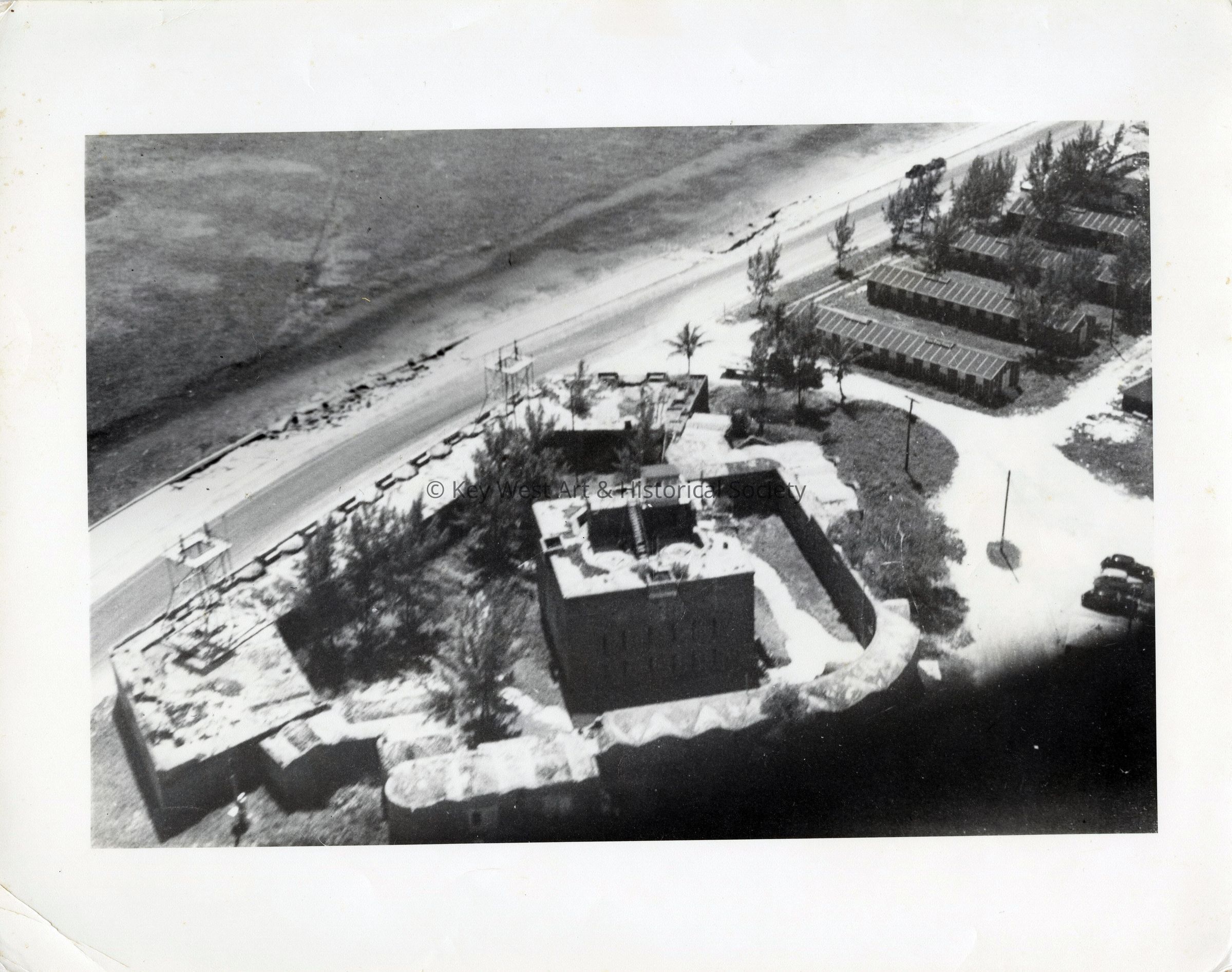 Black and white aerial photograph of Fort East Martello and South Roosevelt Boulevard.