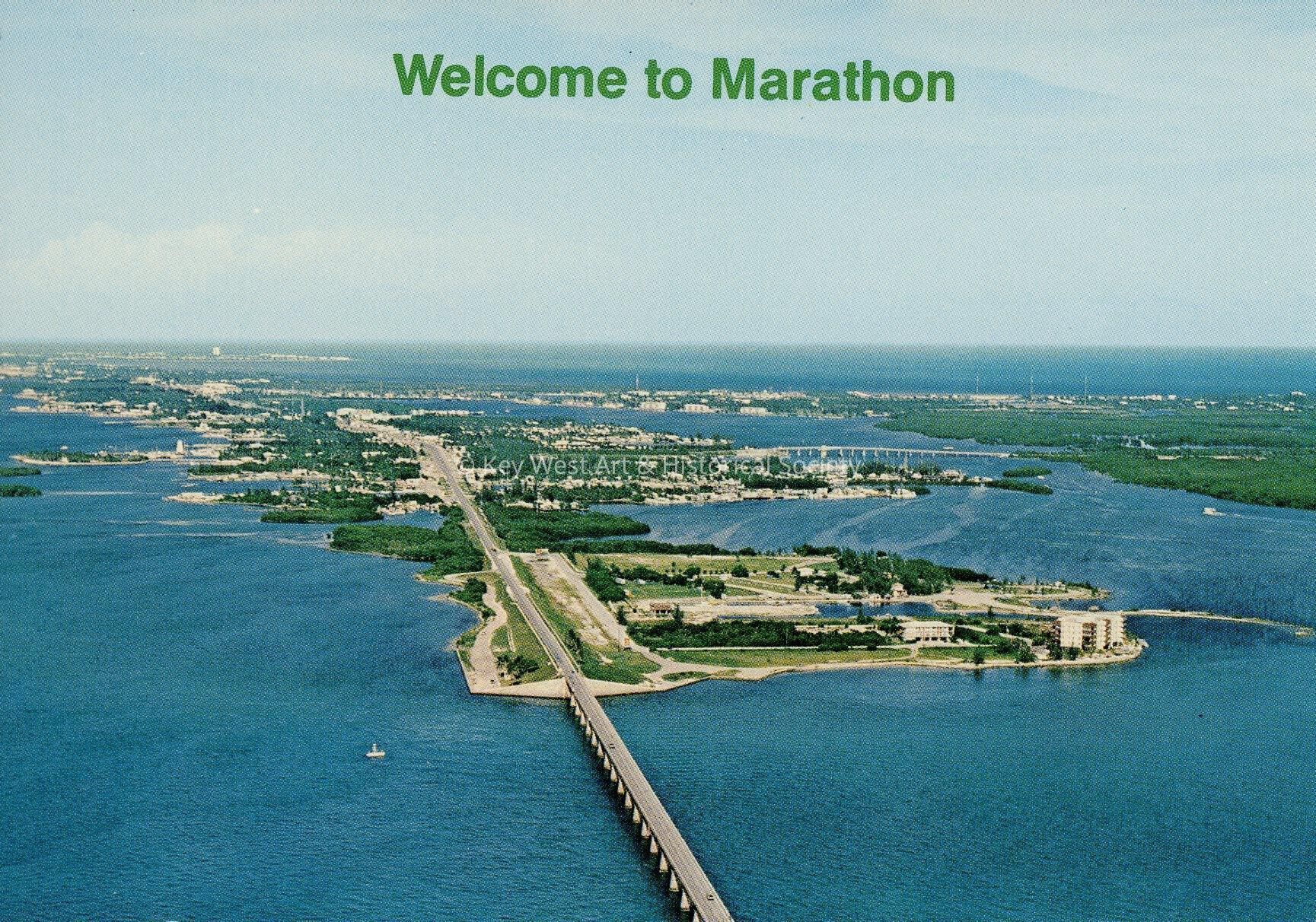 Postcard depicting an aerial view of Marathon. Description on verso reads, 'Blue water and golden sun welcome visitors to the vacation delights of Marathon, one of the beautiful Florida Keys.'Collection