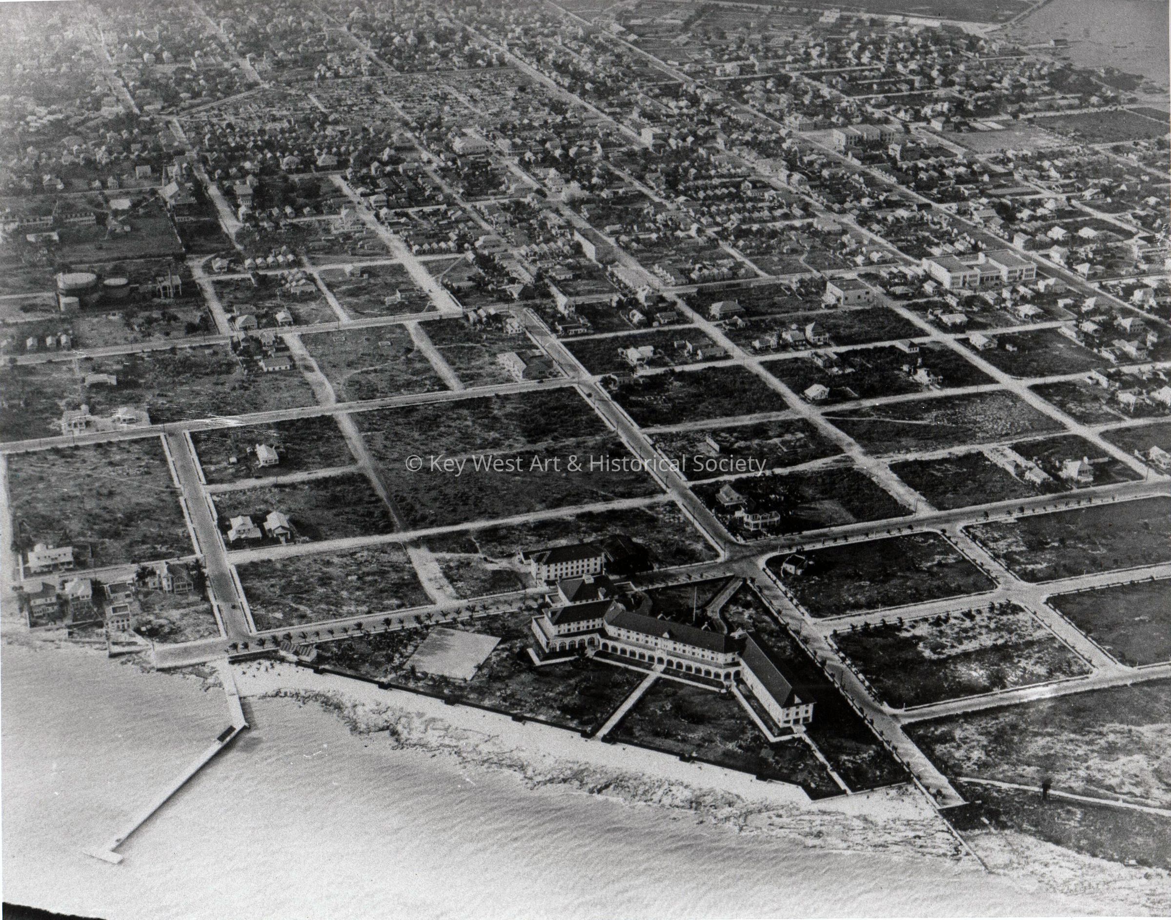 Black and white aerial view of the Casa Marina Hotel and surrounding area of Key West.