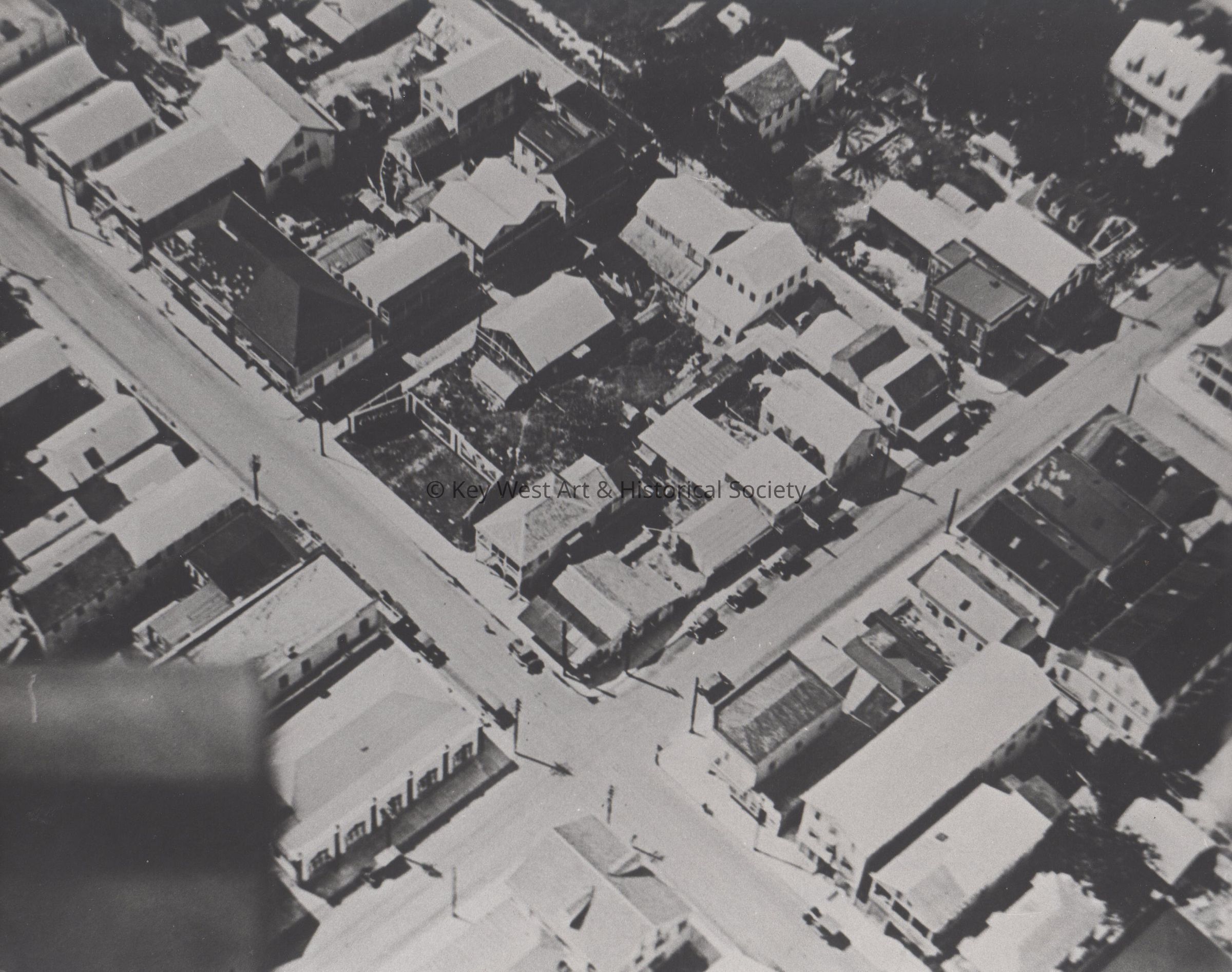 Black and white aerial photograph of the corner of Duval and Greene streets. Sloppy Joe's is visible in the bottom left corner.