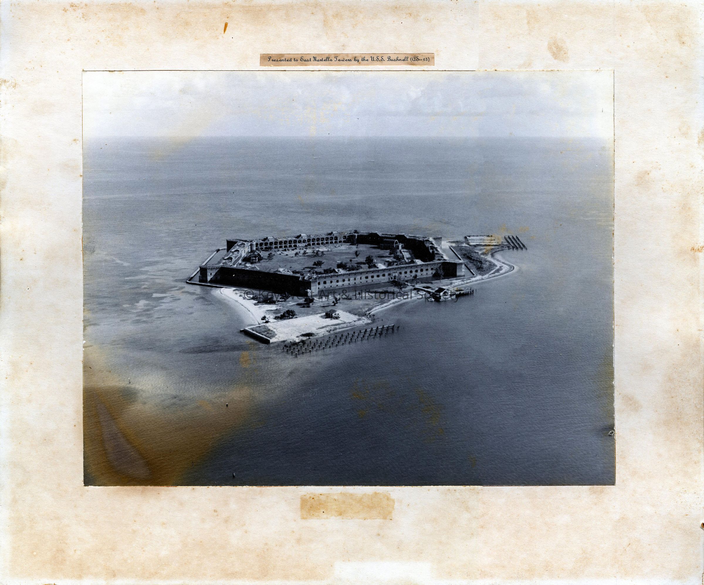 Black and white aerial photograph of Fort Jefferson in the Dry Tortugas. The image was presented to the Fort East Martello Museum by the U.S.S. Bushnell.