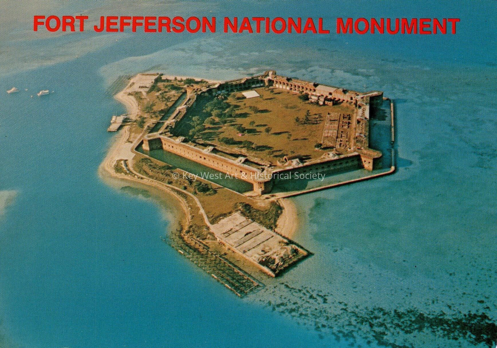 Postcard depicting an aerial view of Fort Jefferson National Monument. Description on verso reads, 'Fort Jefferson National Monument on Garden Key in the Dry Tortugas (turtles), located 68 miles from Key West, as viewed from an 'Inter Island Air' seaplane based in Key West, Florida.'Collection