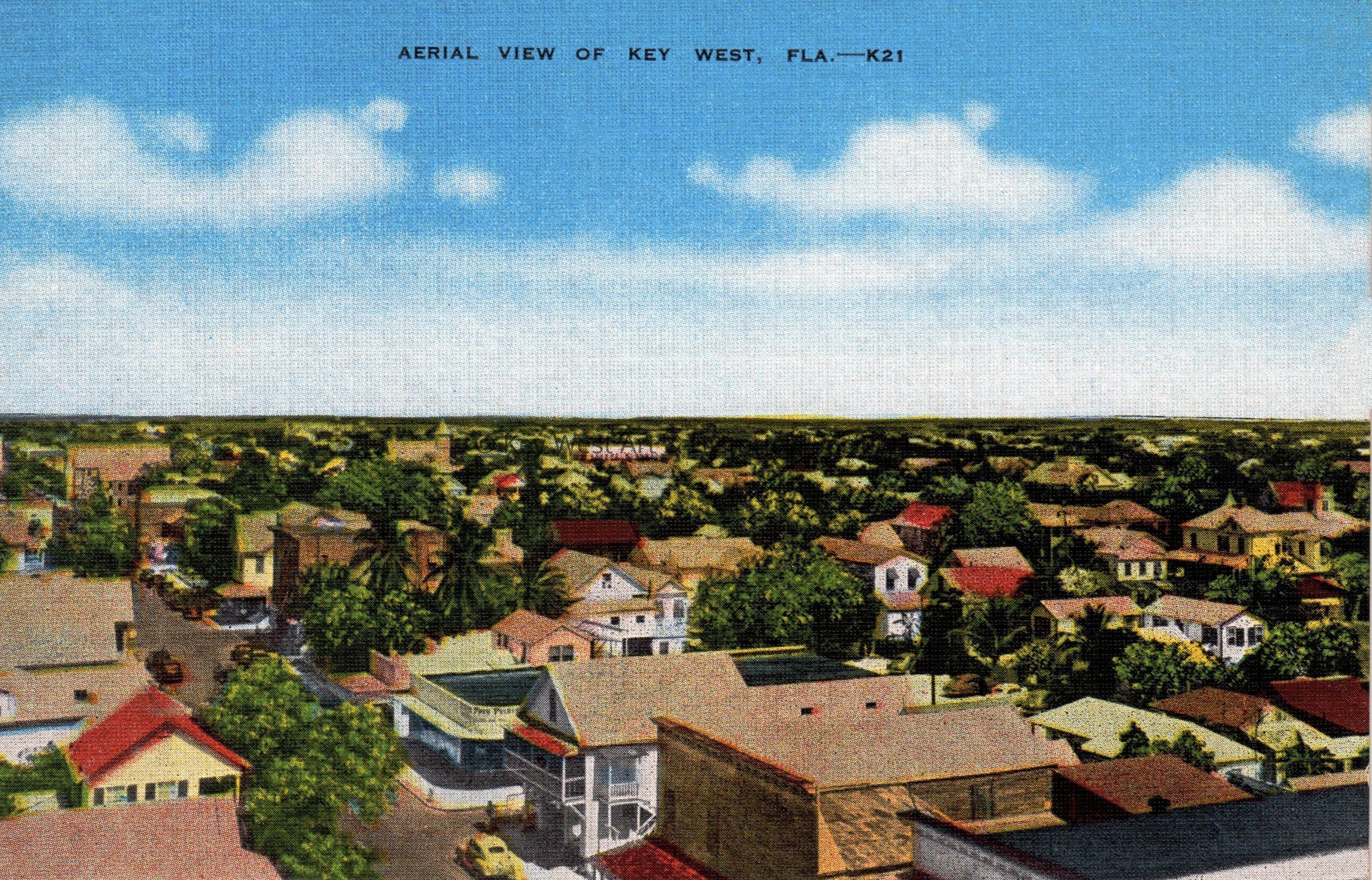 Postcard depicting rooftops and foliage. The caption reads, ‘Aerial view of Key West, Florida’. The description on the verso reads, 'Key West is the Southernmost city in the United States. Broad, coral streets, a profusion of tropical vegetation, a delightful city 170 miles from Miami.'Collection