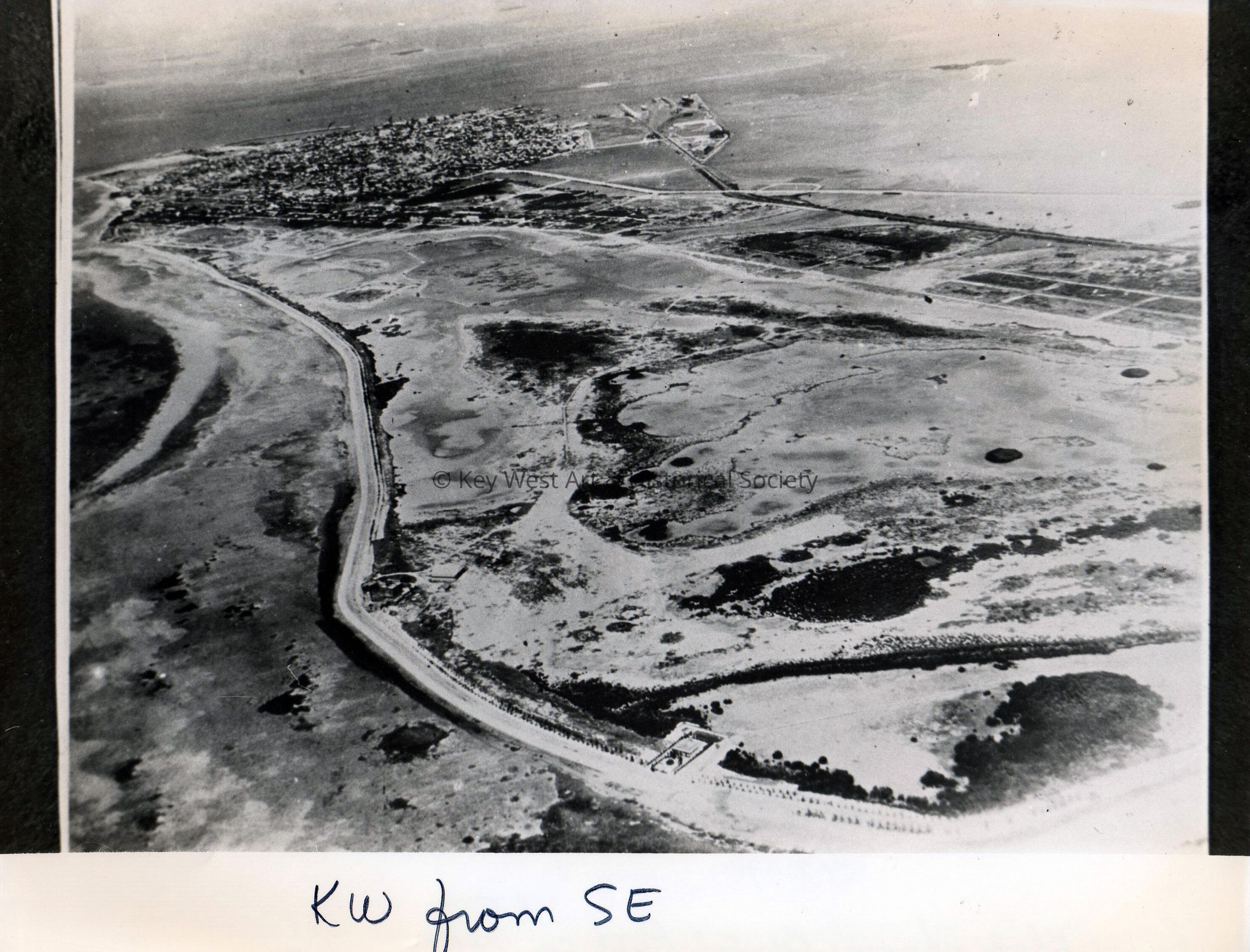 Black and white aerial photograph of the southeastern end of Key West near Fort East Martello.