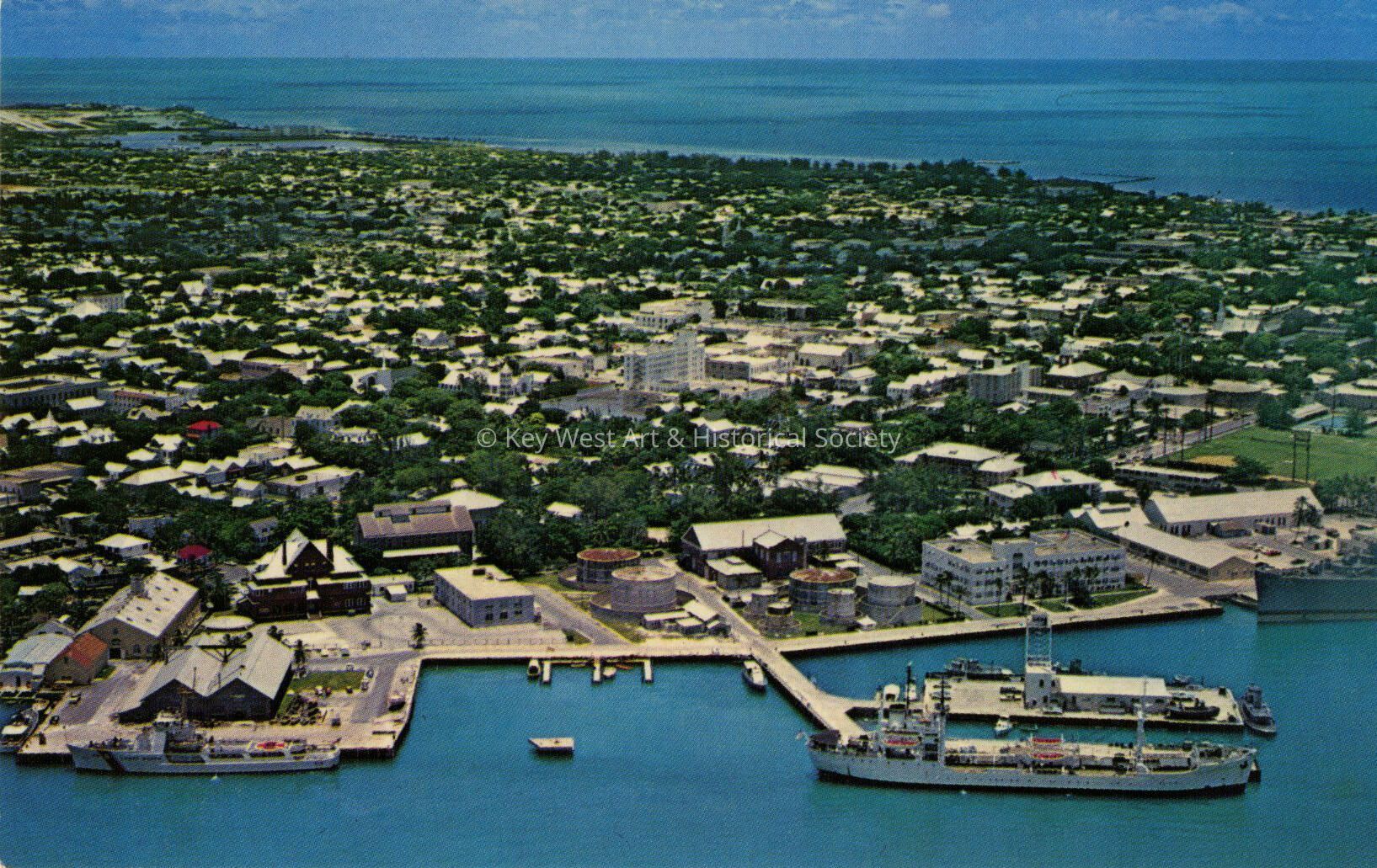 Postcard depicting an aerial view of Key West. The description on the verso reads, 'Aerial view of the southernmost city, quaint old Key West, Florida.'Subject Place
