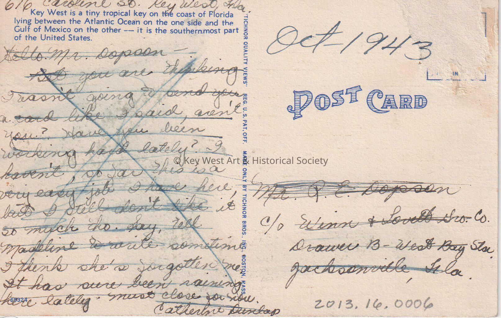 Postcard depicting an aerial view of an island city. The caption reads, ‘Air View of Key West, Florida’. The description on the verso reads, 'Key West is a tiny tropical key on the coast of Florida lying between the Atlantic Ocean on the one side and the Gulf of Mexico on the other - it is the southernmost part of the United States.' The message on the verso reads, 'October, 1943, 616 Caroline Street, Key West, Florida. Hello Mr. Dopson, Bet you are thinking I wasn't going to send you a card like I said, aren't you? Have you been working hard lately? I haven't, so far this is a very easy job I have here but I still don't like it so much though. Say, tell Mabeline to write sometime, I think she's forgotten me. It has sure been raining here lately. Must close for now. Catherine Dunlop'. The card is addressed to Mr. R.E. Dopson, care of Winn and Lovett Grocery Company, Drawer B, West Bay Station, Jacksonville, Florida.Subject Place