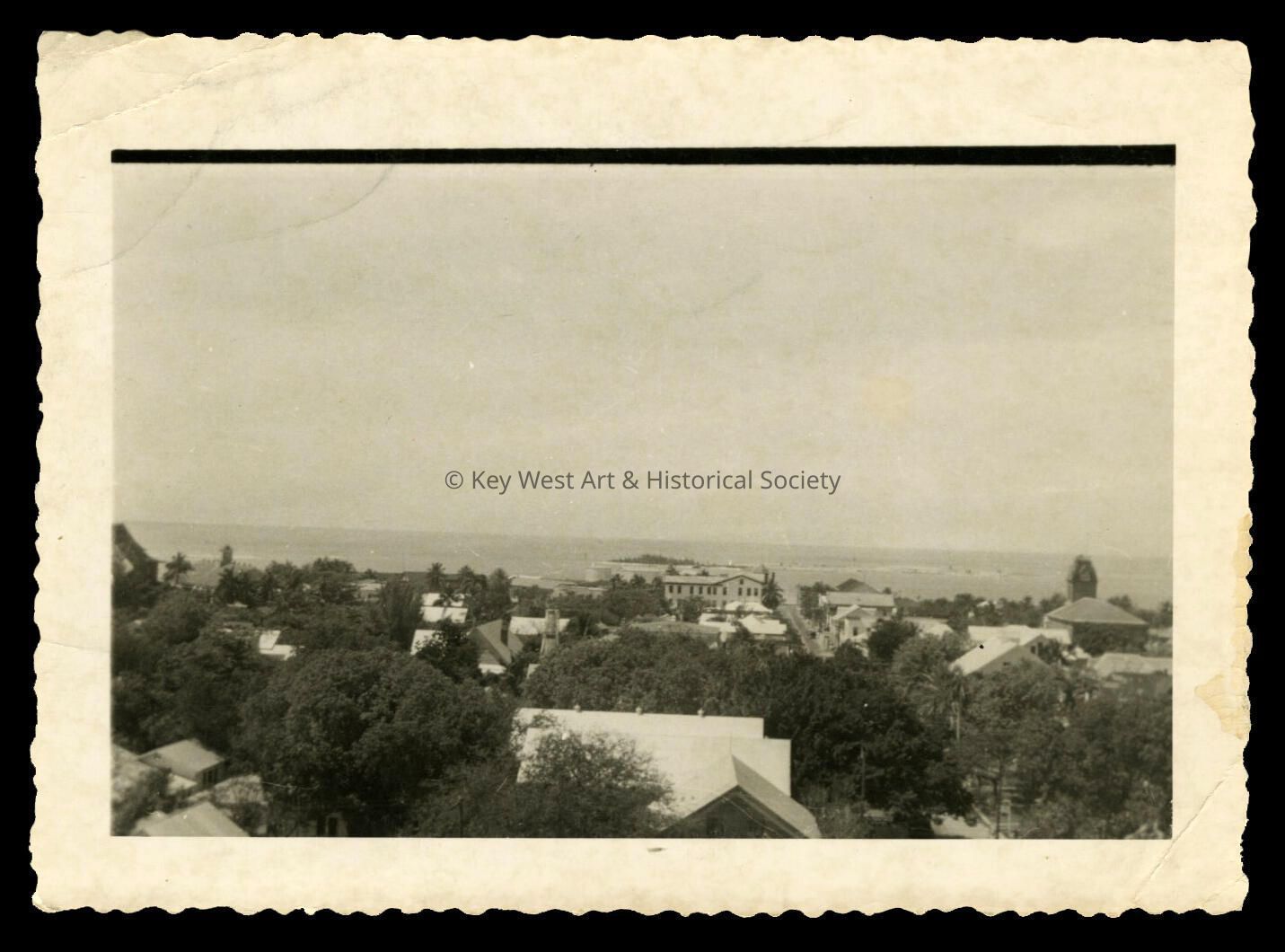 Black and white photograph depicting an aerial view of Key West taken from the top of the La Concha Hotel looking toward Key West Bight.Photograph Details