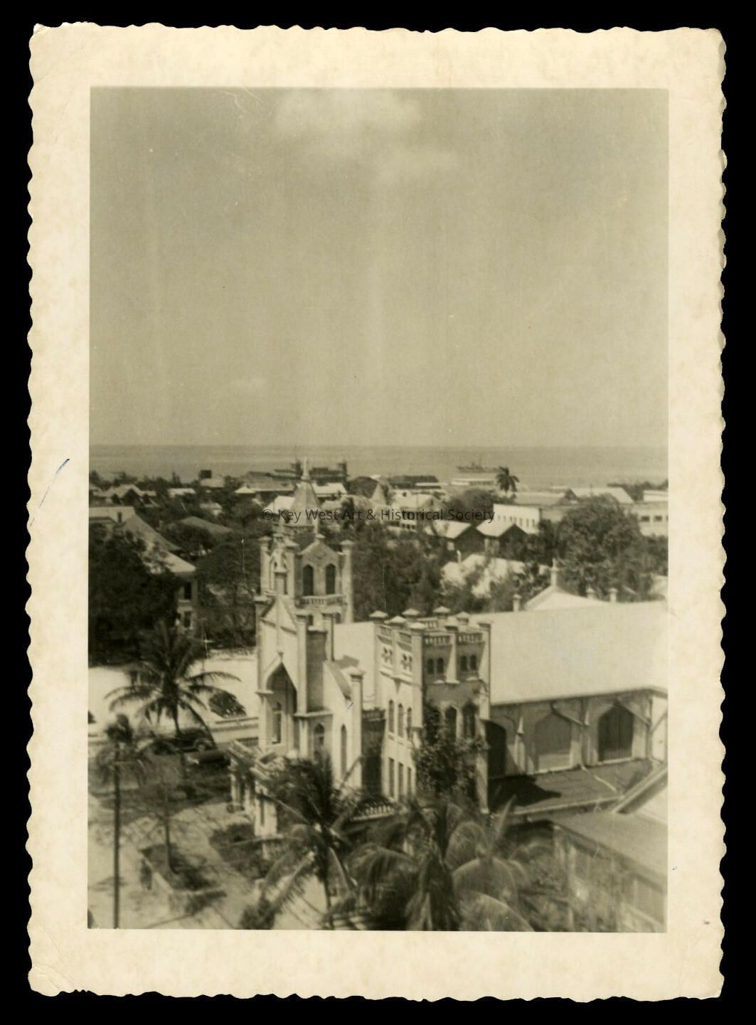 Black and white photograph depicting an aerial view of Key West taken from the top of the La Concha Hotel looking toward St. Paul's Church on Duval Street.