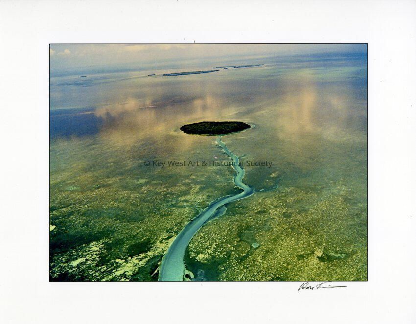 Color aerial photograph of a mangrove island and channel in the Florida Keys. Signed by Kincaid.