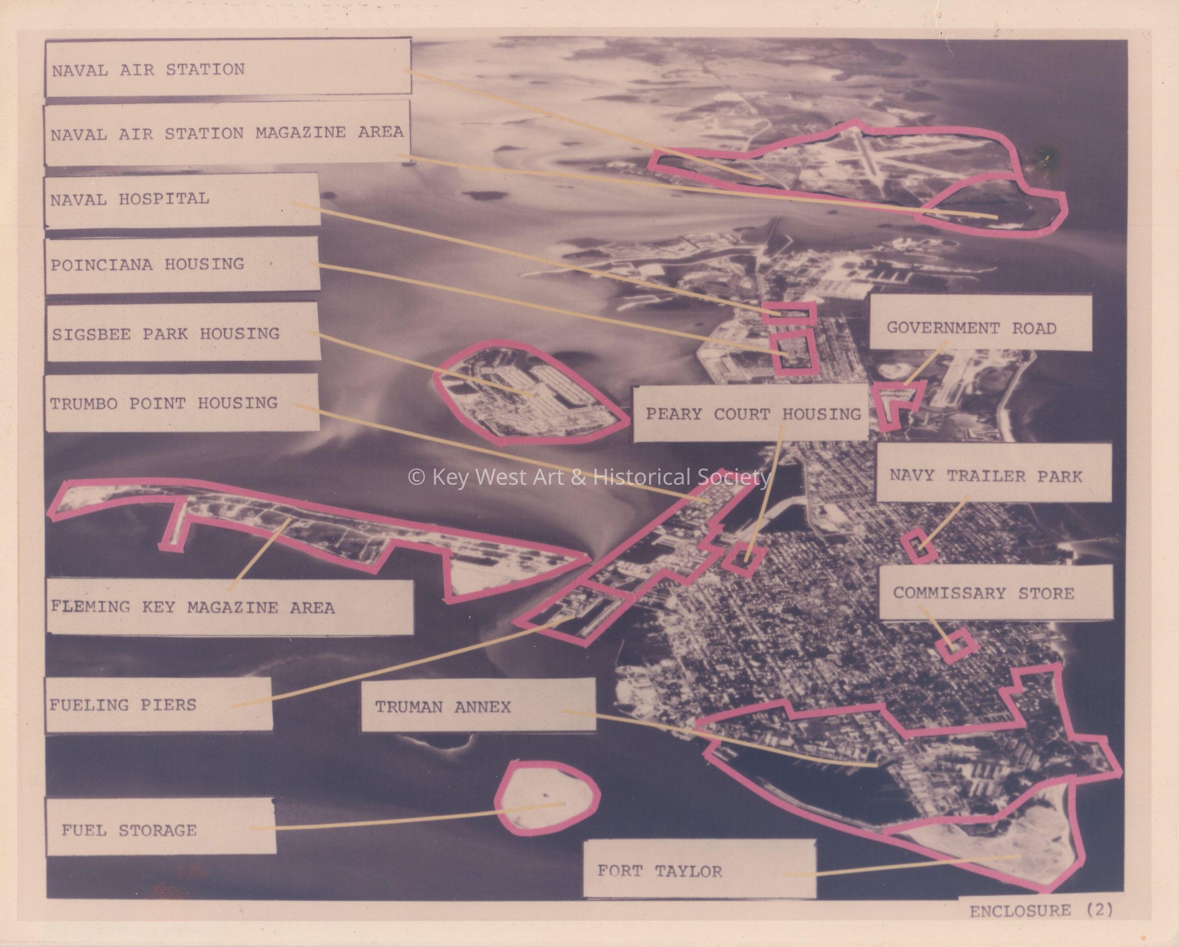 Color aerial photograph of Key West, Stock Island and Boca Chica identifying all Naval Air Station Key West properties. Naval Air Station Magazine Area, Naval Hospital, Poinciana Housing, Sigsbee Park Housing, Trumbo Point Housing, Government Road, Peary Court Housing, Navy Trailer Park, Commissary Store, Fleming Key Magazine Area, Fueling Piers, Truman Annex, Fuel Storage and Fort Taylor.Photograph Details