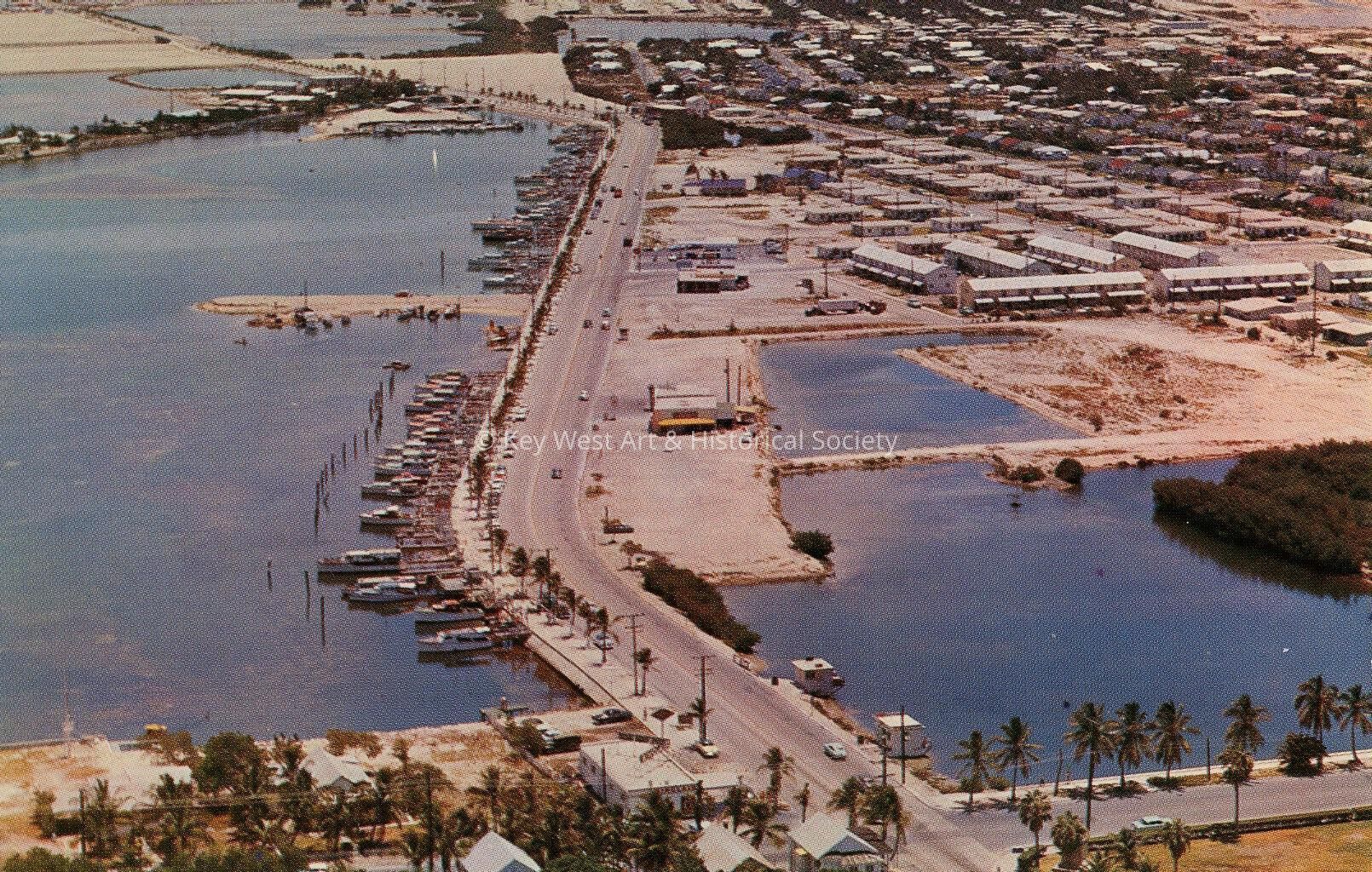 Postcard depicting an aerial view of North Roosevelt Boulevard. Description on verso reads, 'Airview of Roosevelt Boulevard showing Stock Island in background, Key West, Florida.'Subject Place
