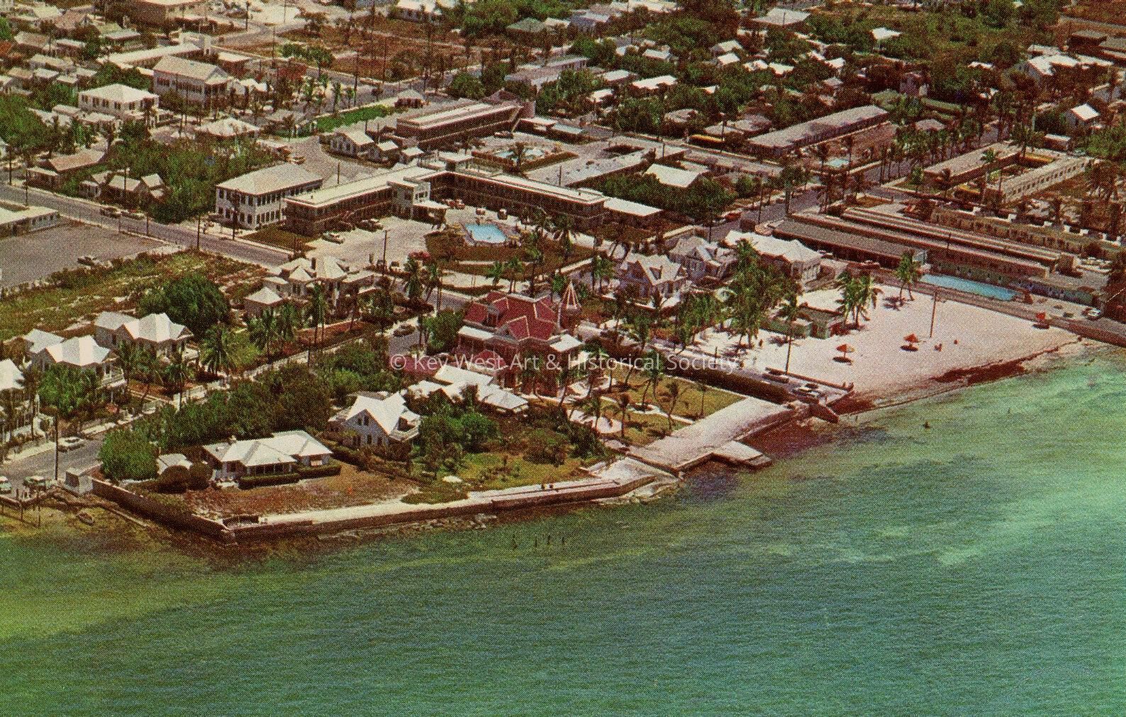 Postcard depicting an aerial view of the southernmost point of Key West. Description on verso reads, 'The southernmost point of land in the United States. South Beach and resort hotels in background. Key West, Florida.'Subject Place