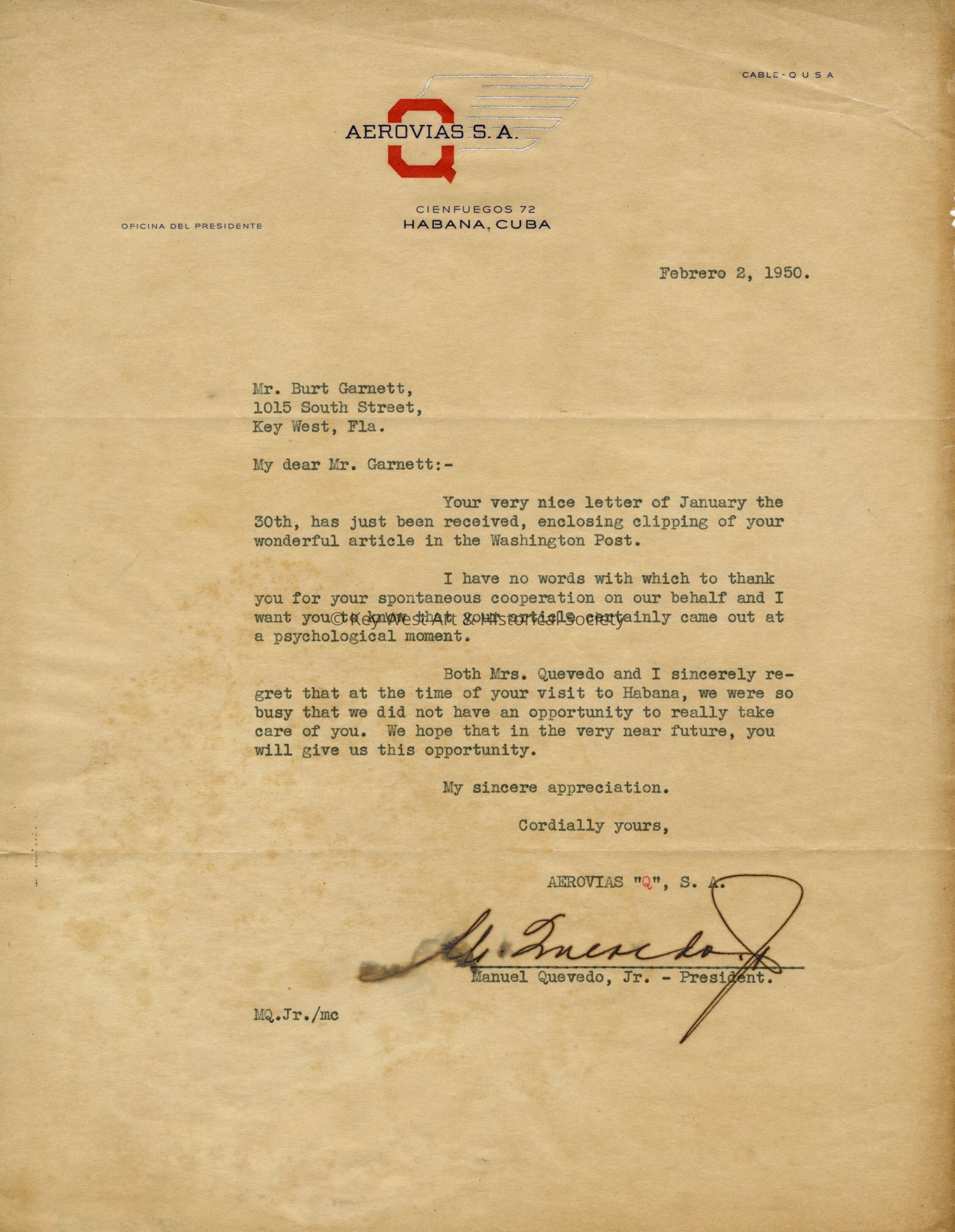 A typewritten letter on Aerovias S.A. airlines letterhead written by Manuel Quevedo, Jr. in Havana, Cuba to Burt Garnett in Key West.Collection