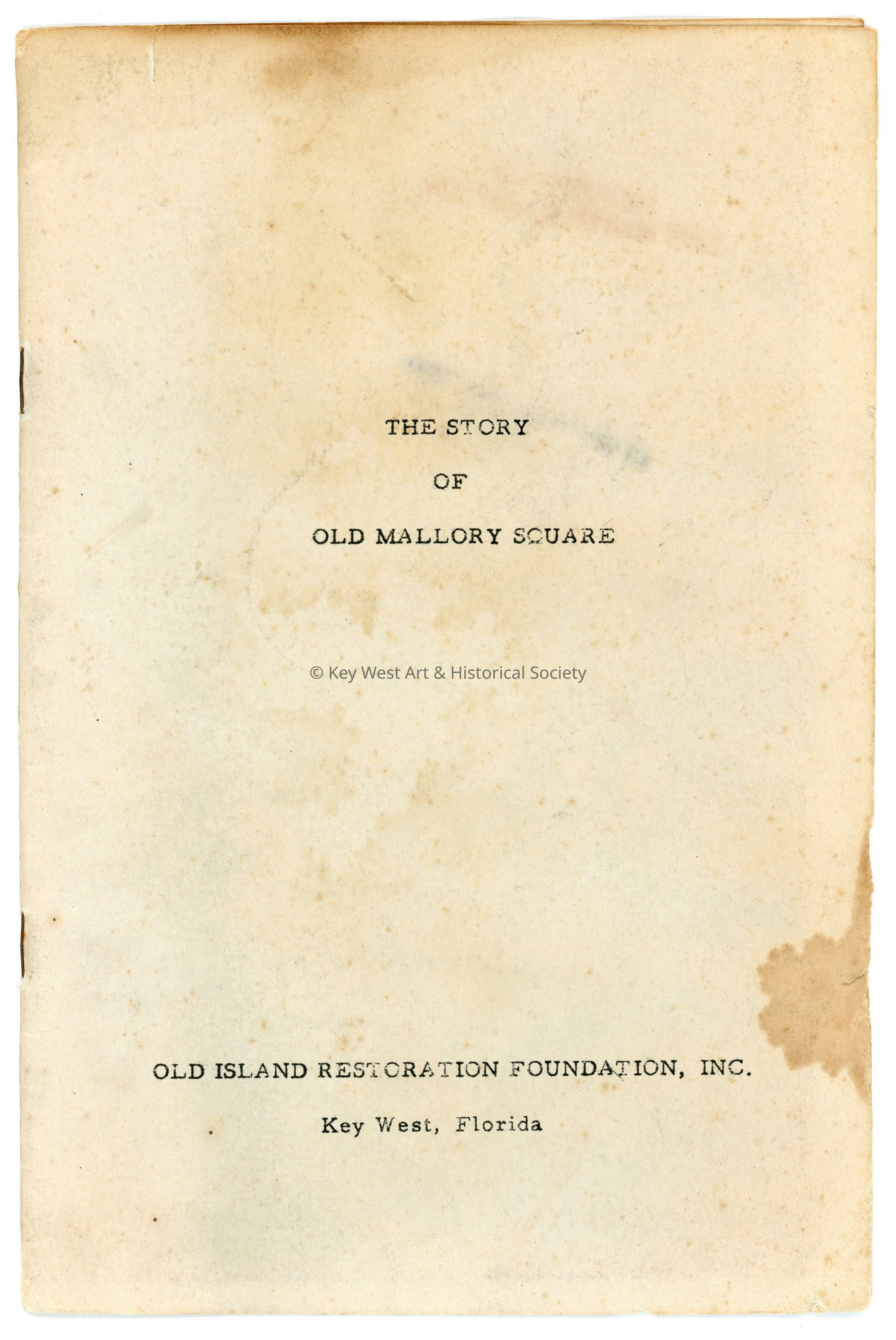 Booklet written by the Old Island Restoration Foundation detailing the history of Old Mallory Square. Inside is information concerning the naming of the square after Stephen R. Mallory, descriptions of prominent buildings, and the future of Mallory Square.Collection