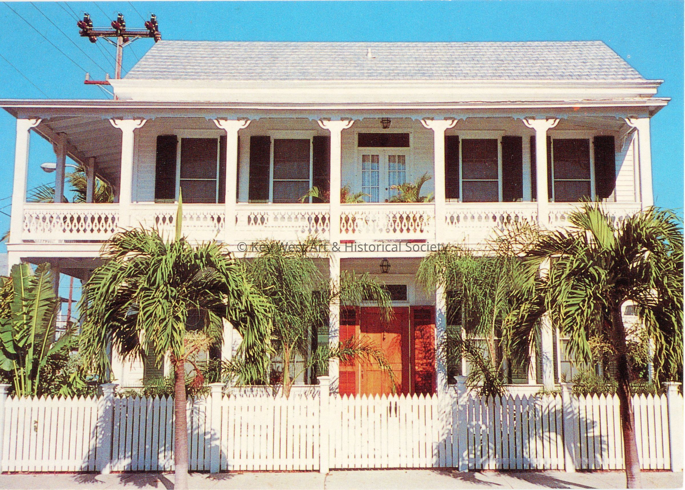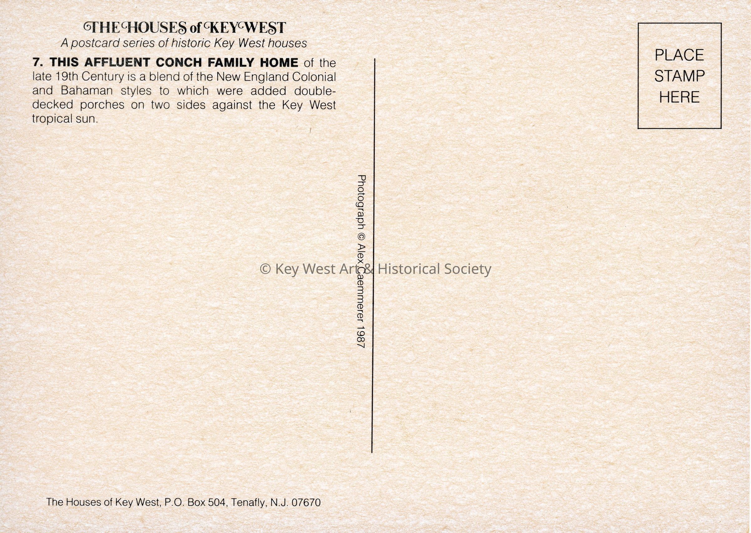 Postcard belonging to 'The Houses of Key West' series depicting a two story Key West home with a two story wrap around porch. Notation on verso reads '7. THIS AFFLUENT CONCH FAMILY HOME of the late 19th Century is a blend of the New England Colonial and Bahaman styles to which were added double-decked porches on two sides against the Key West tropical sun.'Subject Place