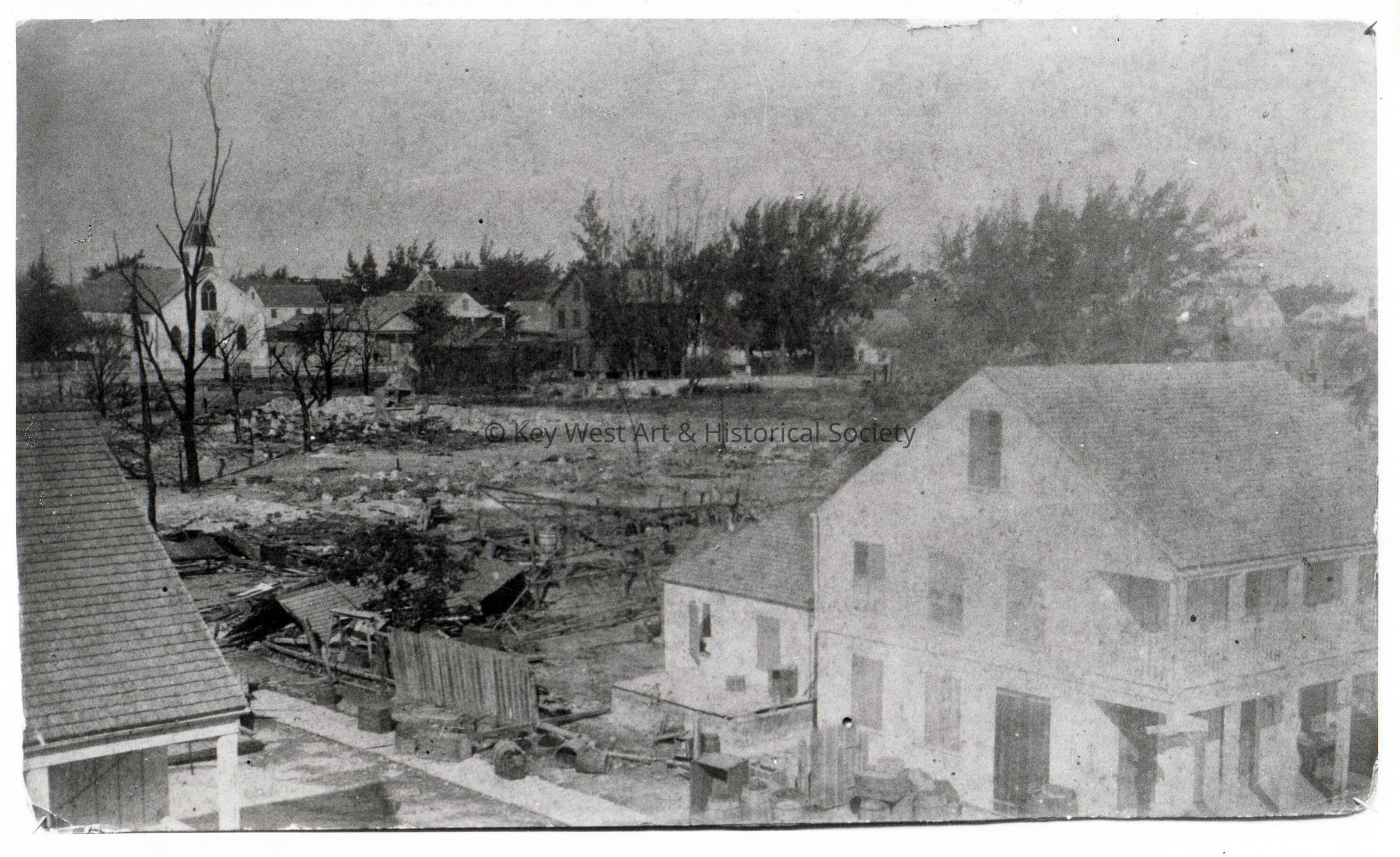 Black and white photograph taken from Fleming Street across Duval Street at St. Mary Star of the Sea Church after the Great Fire of April 1886.