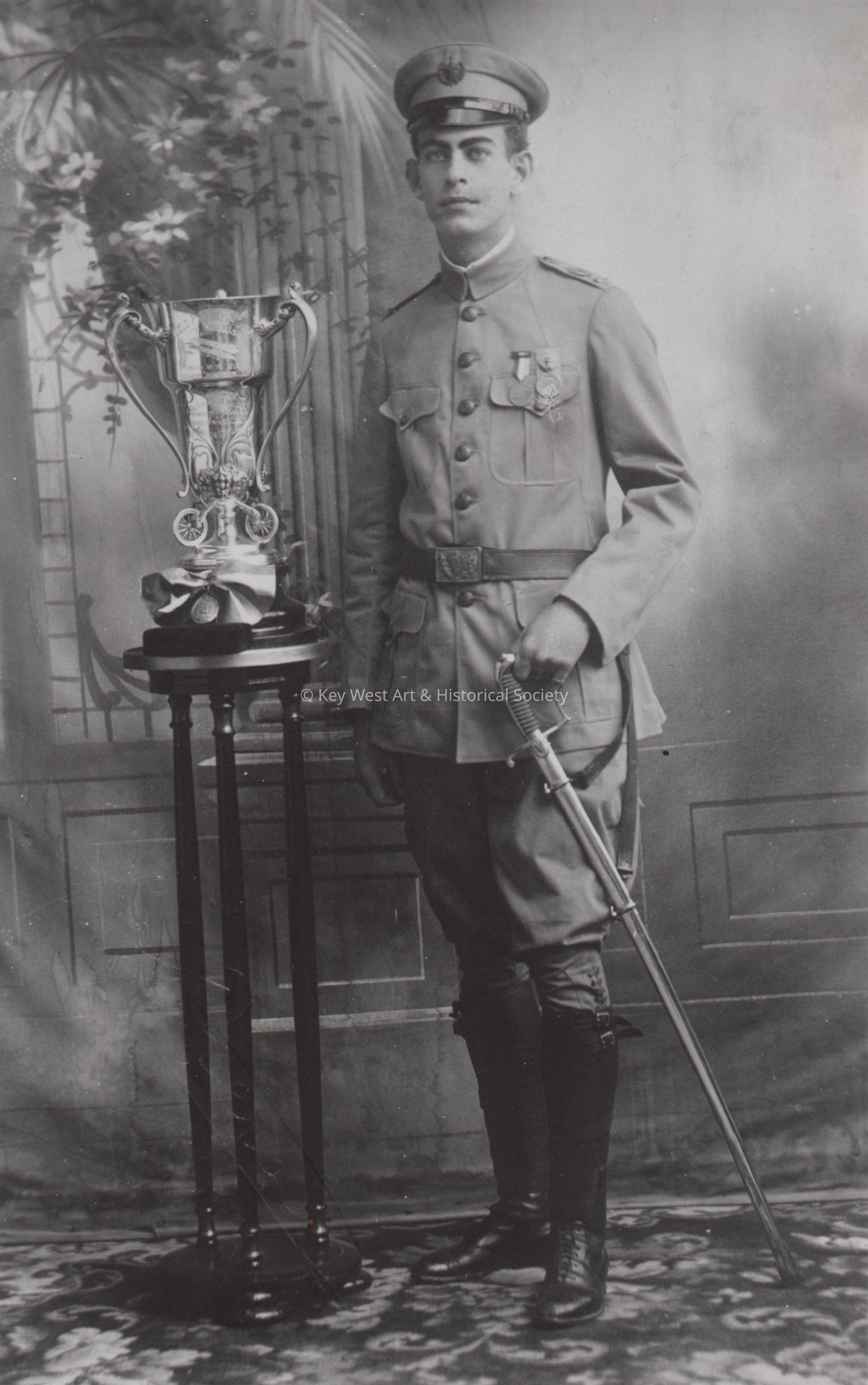 Black and white photograph of the second man to fly between Key West and Cuba, Agustin Parla, in 1913.