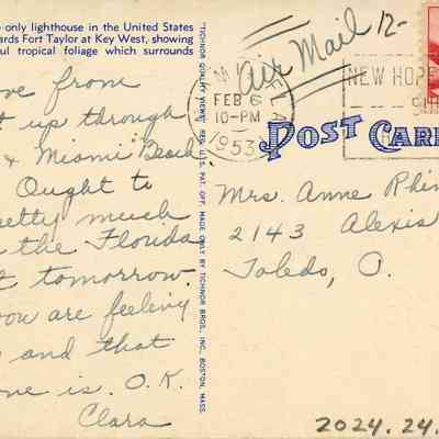 Postcard depicting an aerial view of Fort Taylor from the Lighthouse in Key West. "Looking from the only lighthouse in the United States within city limits towards Fort Taylor at Key West, showing some of the beautiful tropical foliage which surrounds nearly evrey house."Collection