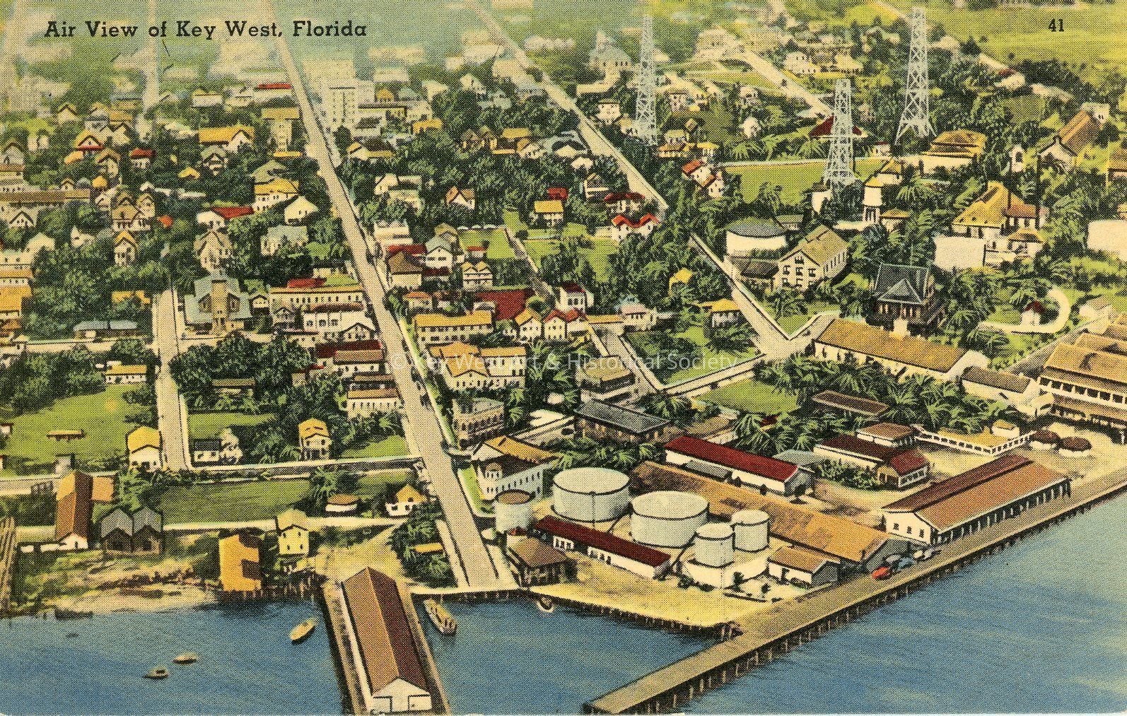 Postcard depicting an air view of Key West. "Key West is a tiny tropical key on the coast of Florida lying between the Atlantic Ocean on the one side and the Gulf of Mexico on the other - it is the southernmost part of the United States."Collection
