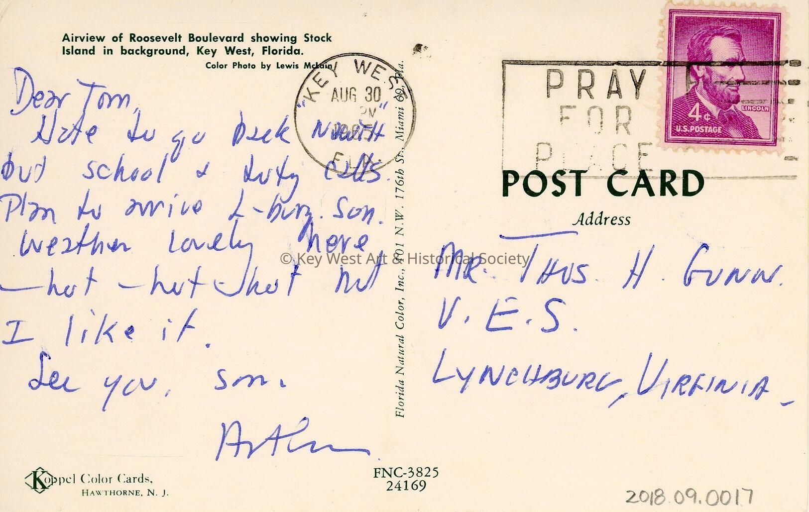 Postcard depicting an aerial view of North Roosevelt Boulevard. Description on verso reads, 'Airview of Roosevelt Boulevard showing Stock Island in background, Key West, Florida.' Message on verso reads, 'Dear Tom, Hate to go back north but school & duty calls. Plan to arrive L-burg Sun. Weather lovely here - hot - hot - hot, but I like it. See you soon. Arthur.'