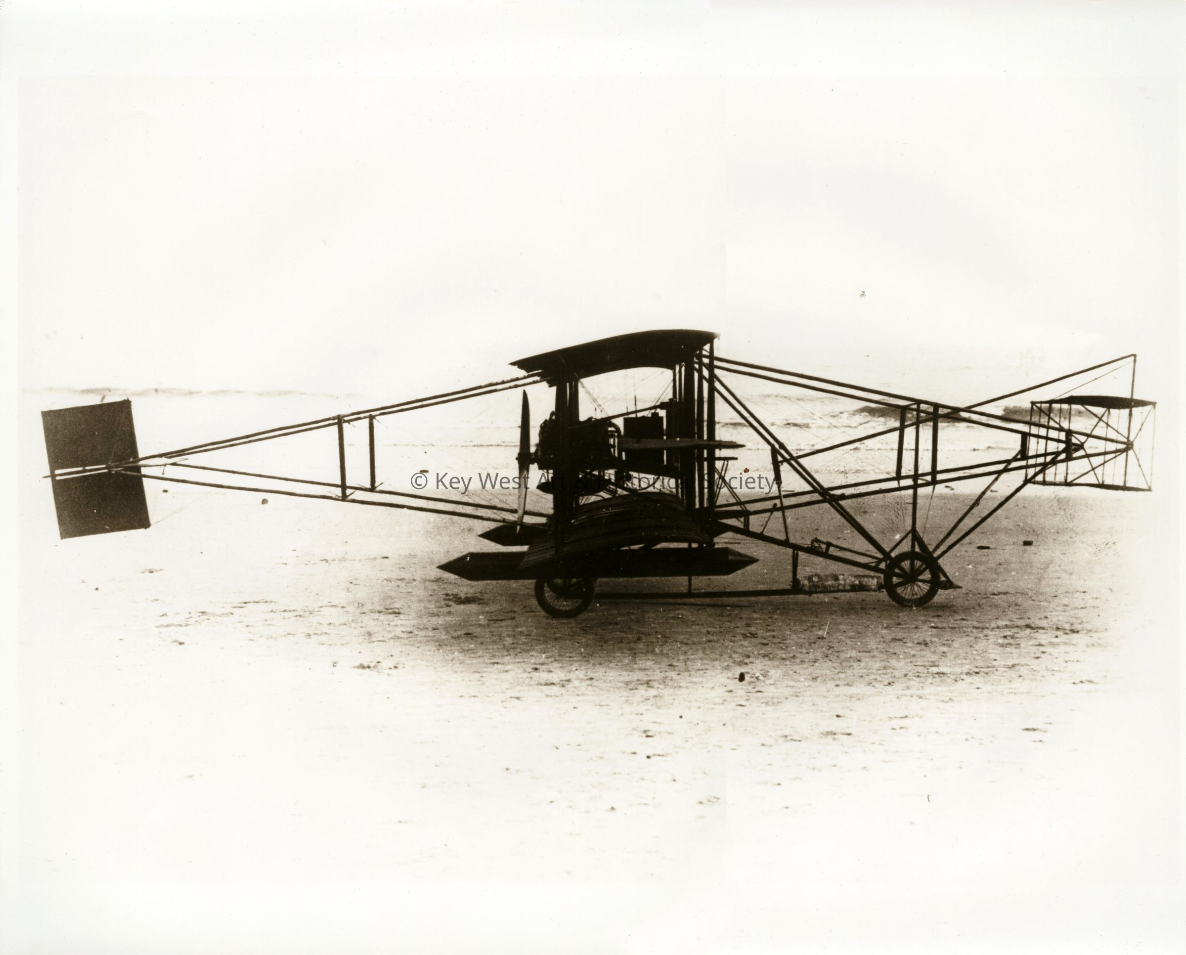 Black and white photograph of the airplane belonging to John Alexander Douglas McCurdy that he used during his flight attempt from Key West to Cuba.