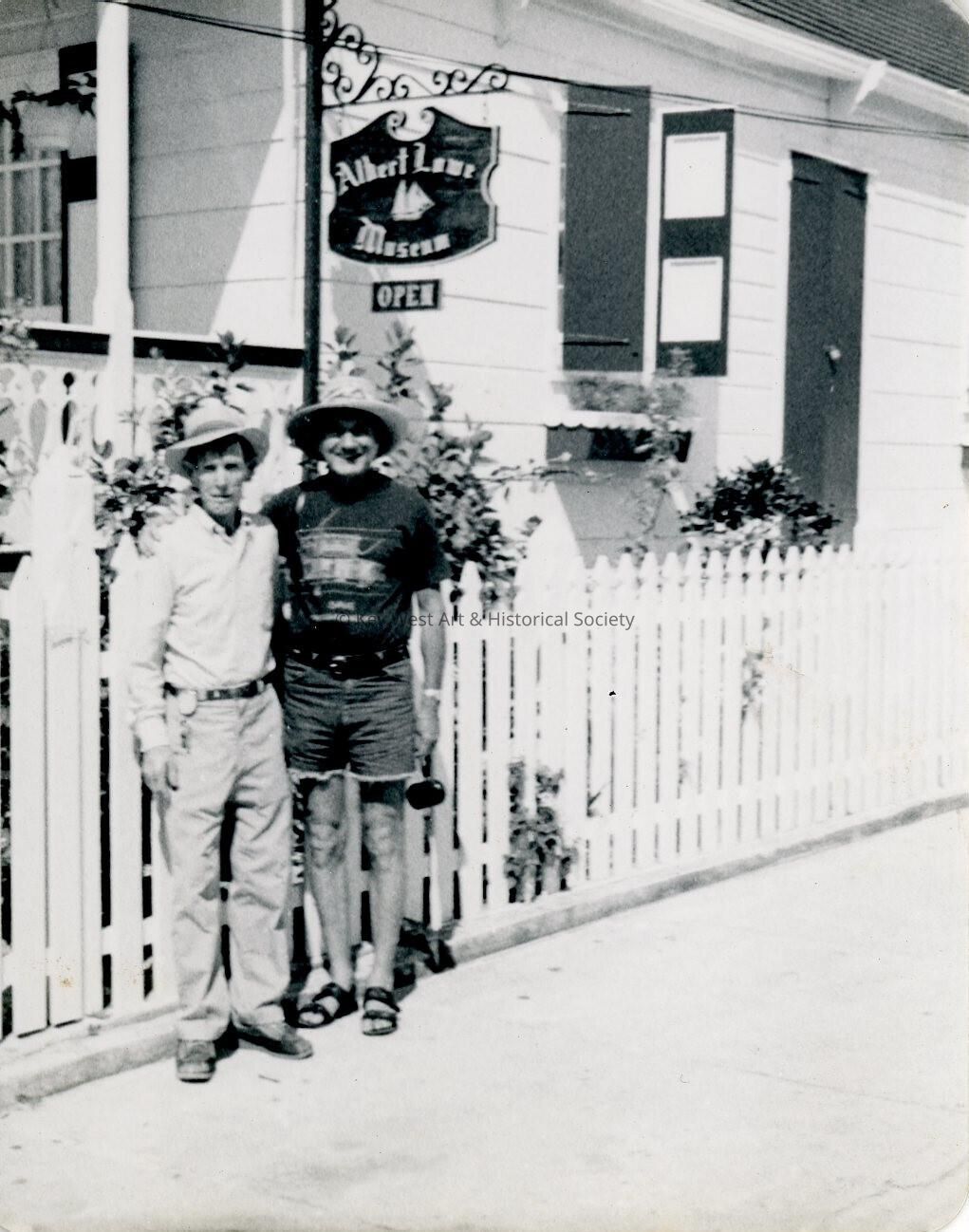 Black and white photograph of two unknown men standing outside the Albert Lowe Museum in New Plymouth, Green Turtle Cay, Abaco, Bahamas. Man on left possibly Toby Bruce.Collection