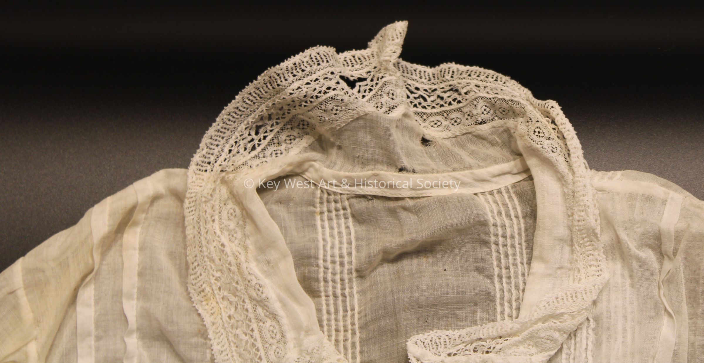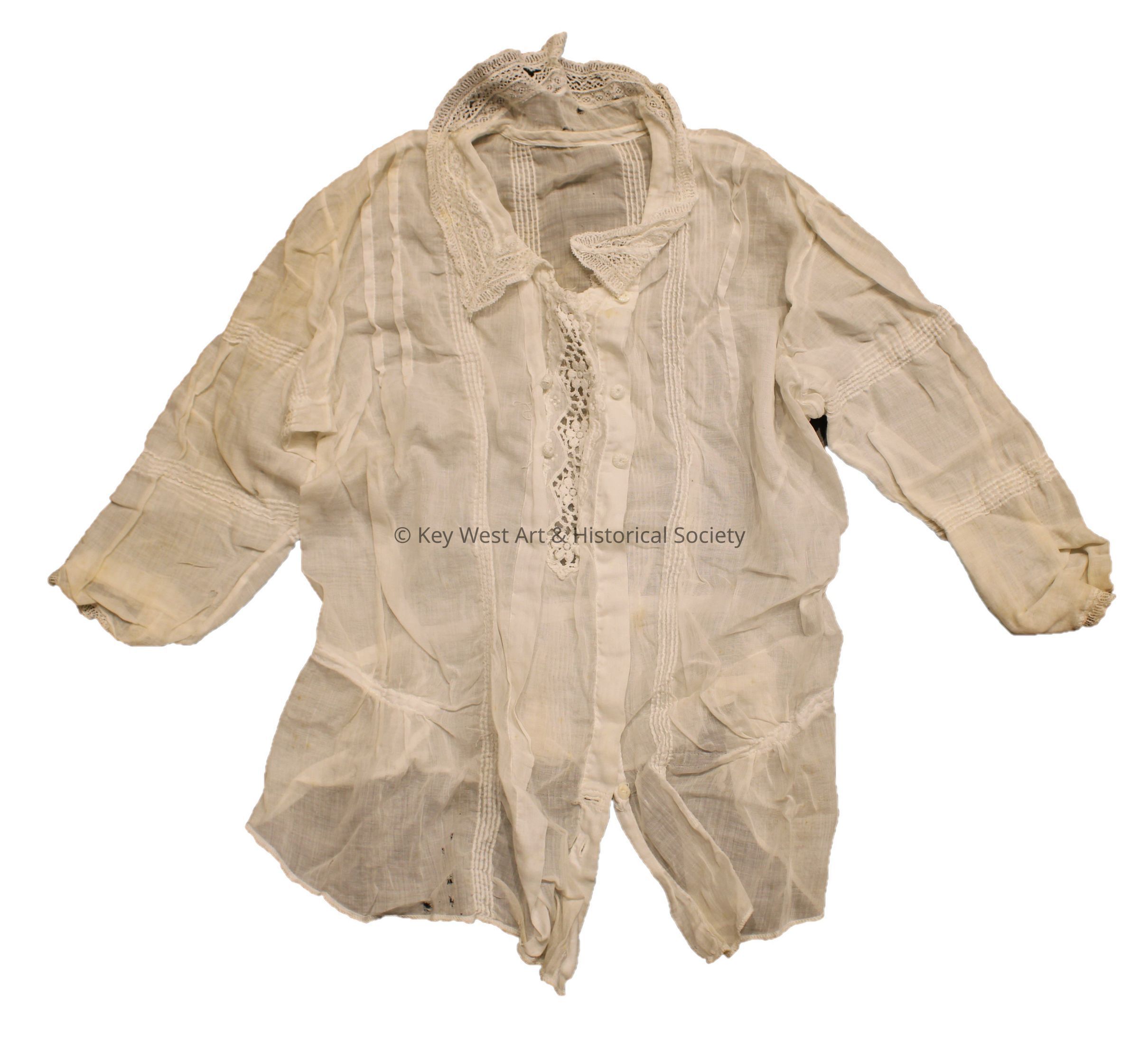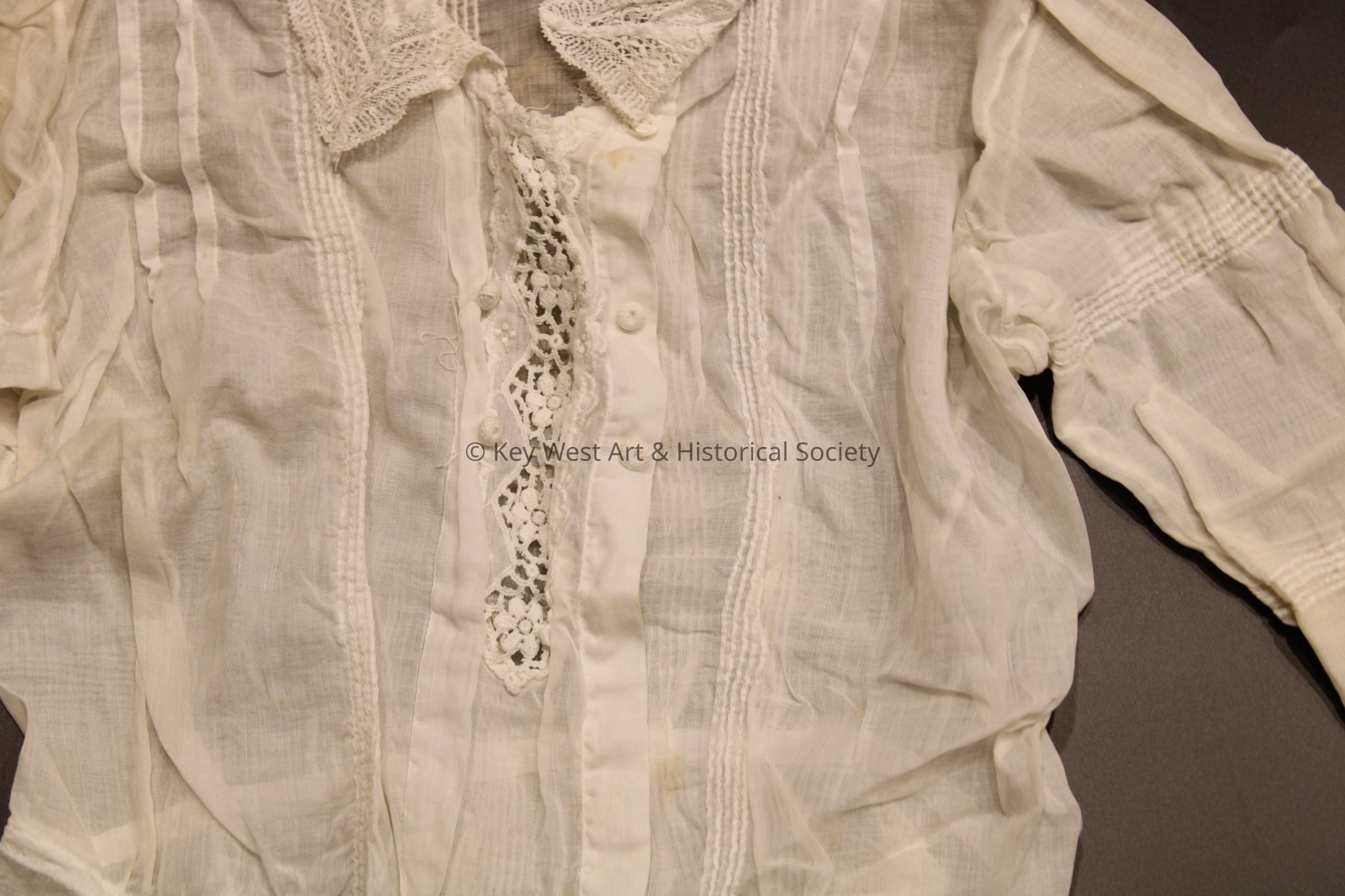 White cotton button down sleeved shirt that purportedly once belonged to artist Alice Terry. There is fine lace detailing around the collar, chest, and the end of the arms as well as stitched detailing throughout the top.