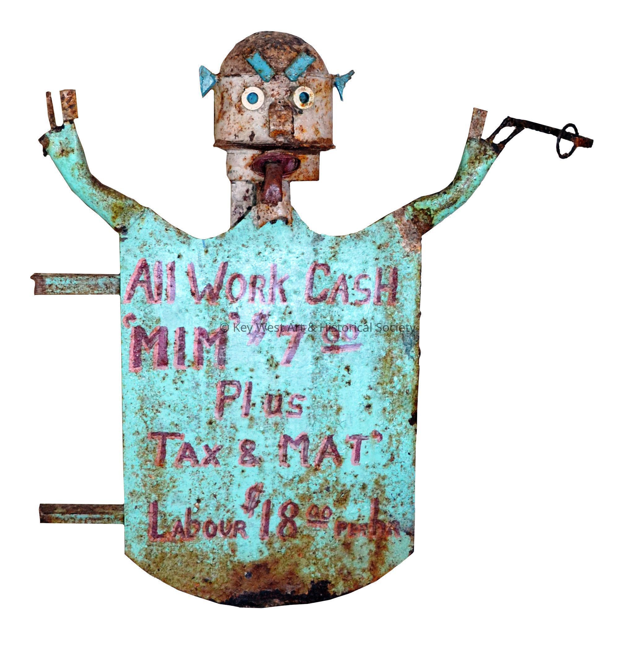 Freestanding sculpture by Stanley Papio depicting an aqua painted shield-shaped flat sign, above which a grotesque face with an extended tongue and hands raised upward. Holds a stick with ring in end in proper left hand from which hung a white sheet steel balance (now missing). Hangs by a chain around the neck and was originally attached to ax of 1987.01.3023. Sign reads 'All Work Cash 'Mim' $7.00 Plus Tax & Mat Labour $18.00 per hr'.Type of Sculpture