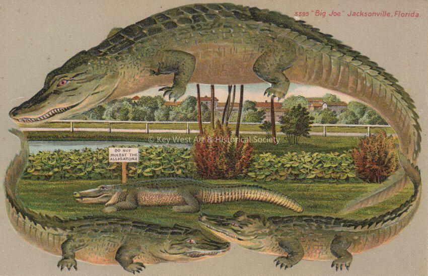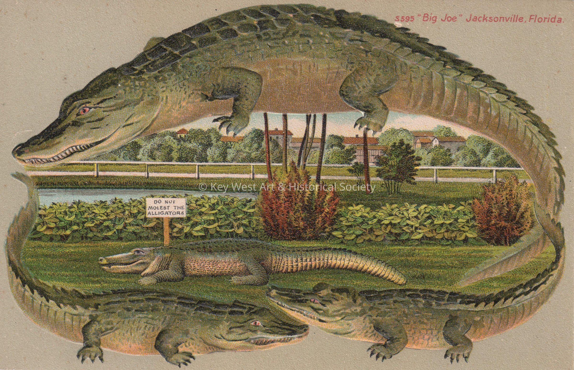 Postcard picturing alligators and a sign reading ‘Do not molest the alligators’. The caption reads, ‘“Big Joe” Jacksonville, Florida.’Collection
