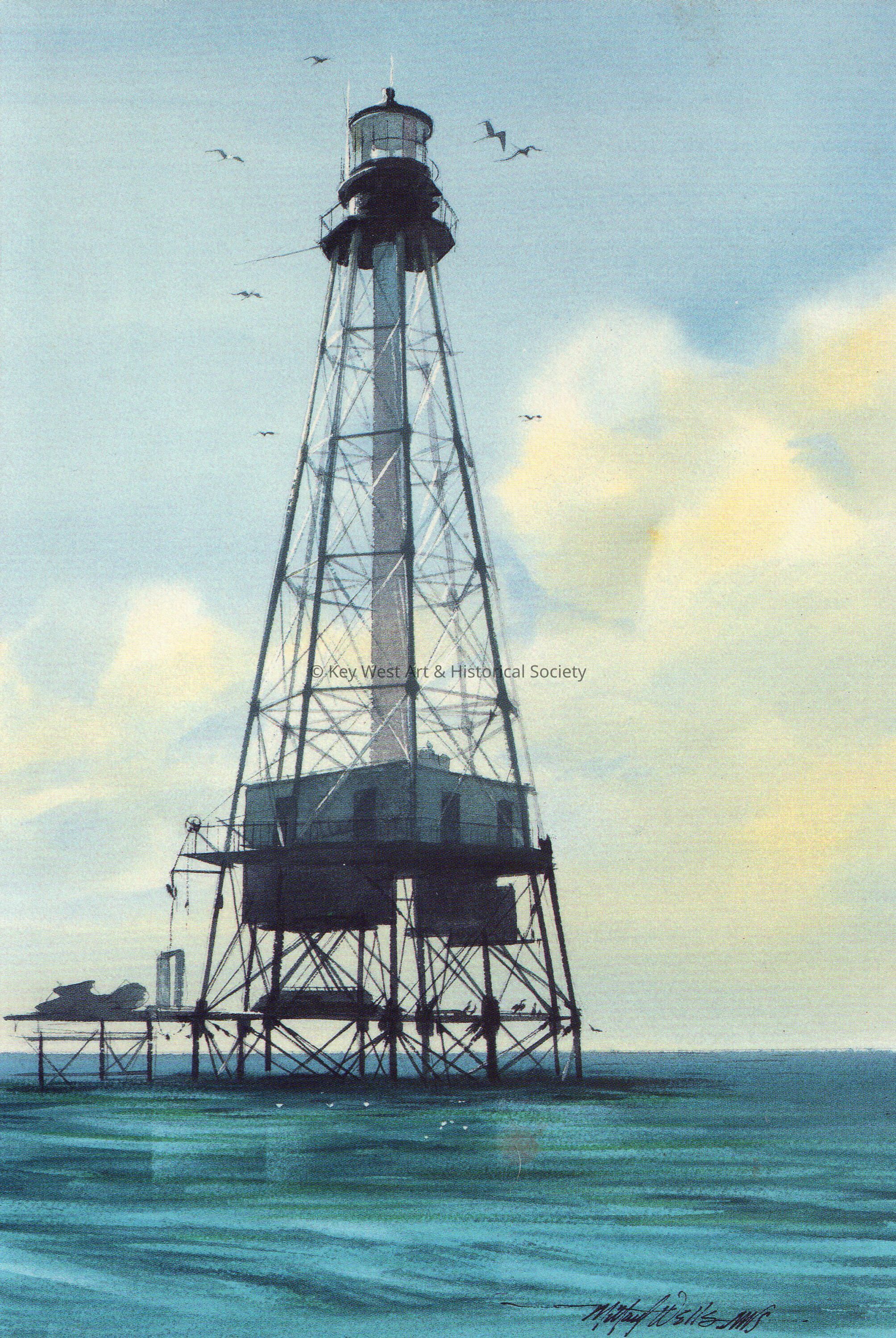 Postcard of Alligator Reef Light. Notation on verso reads, ‘Sections of this lighthouse were assembled on Indian Key and then transported to the reef site four miles away. It was first lighted November 25, 1873.’ The card is postmarked Indian Key Festival, Islamorada, Florida, 33036, Island Station, February 7, 1987.Collection