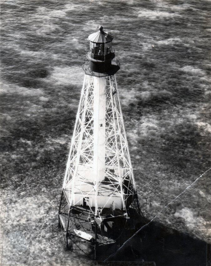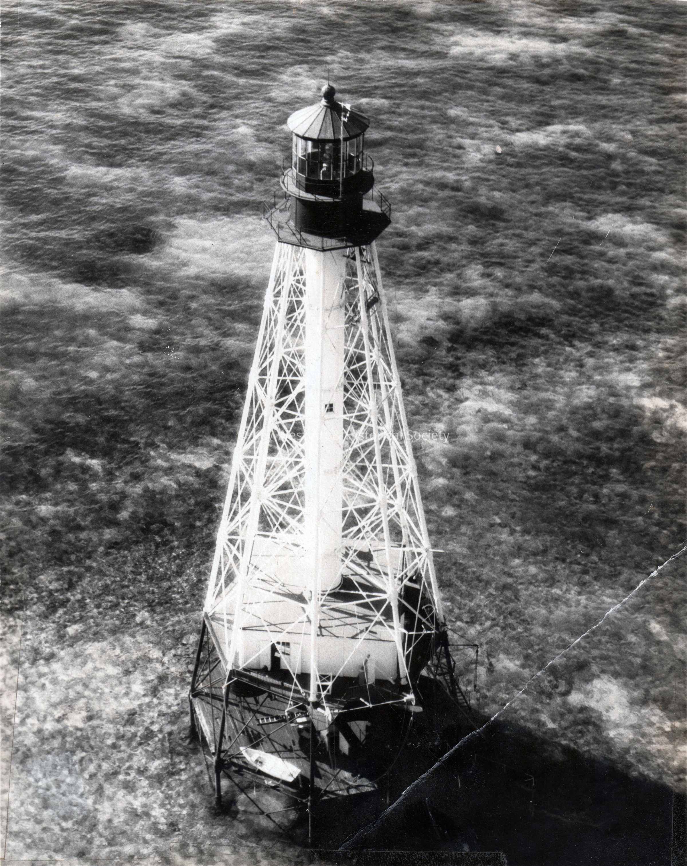 Black and white photograph of Alligator Reef Lighthouse built in 1873 of skeleton iron to resist hurricanes. It is located on the reef about four miles southeast of Matecumbe, Florida.Collection
