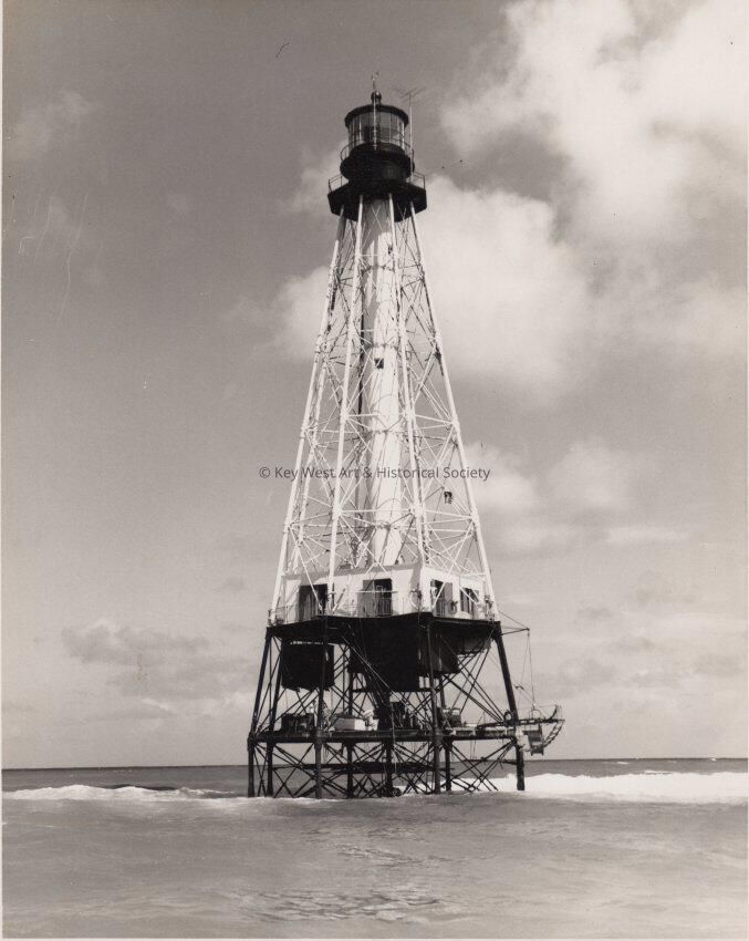 Black and white photograph of Alligator Reef Lighthouse. The lighthouse was built in 1873 of skeleton iron to resist hurricanes. It is located on the reef about four miles southeast of Matecumbe, Florida.Collection