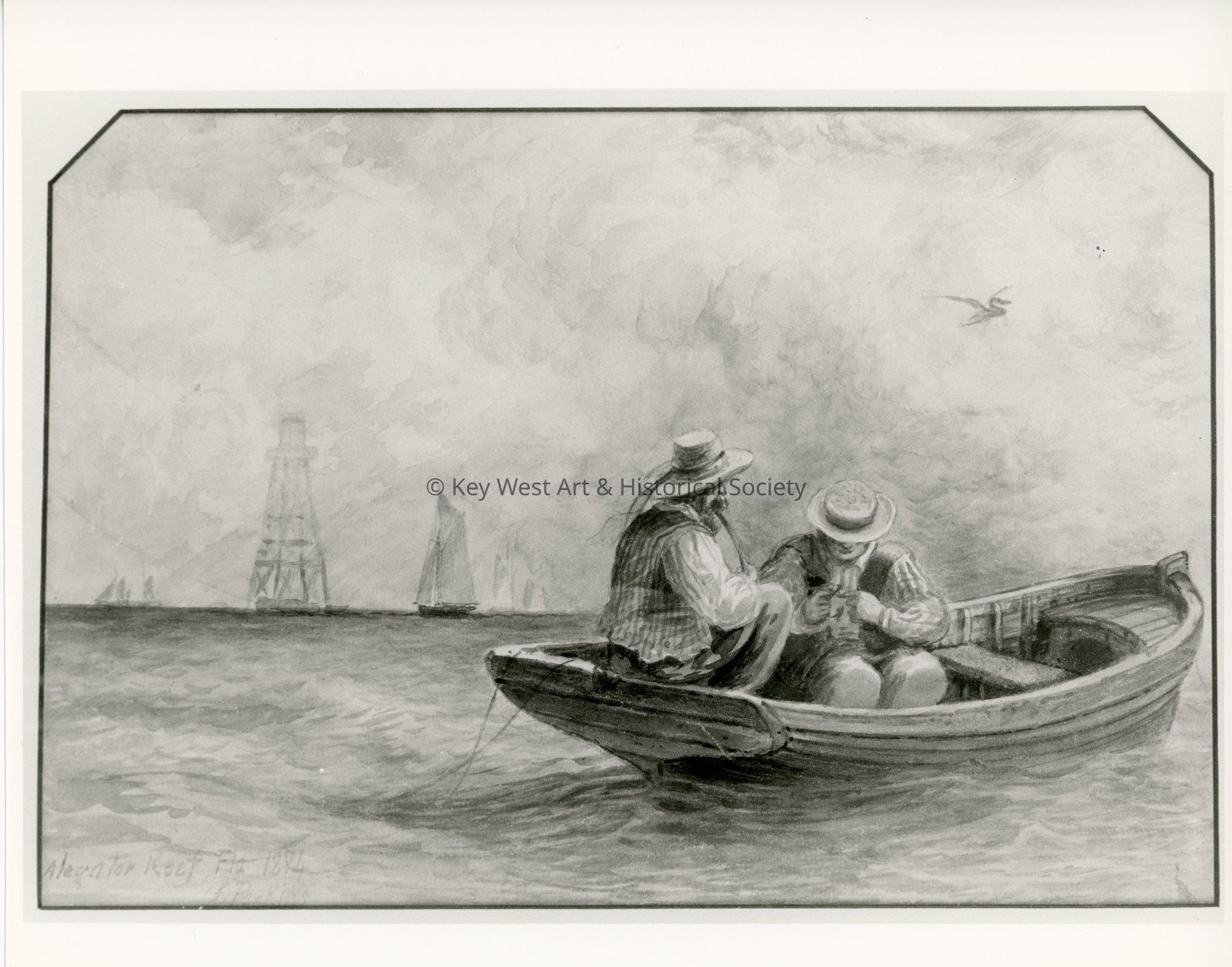 Black and white photograph taken from a drawing by A.P. King of two men in a dinghy with Alligator Reef Lighthouse in the background.