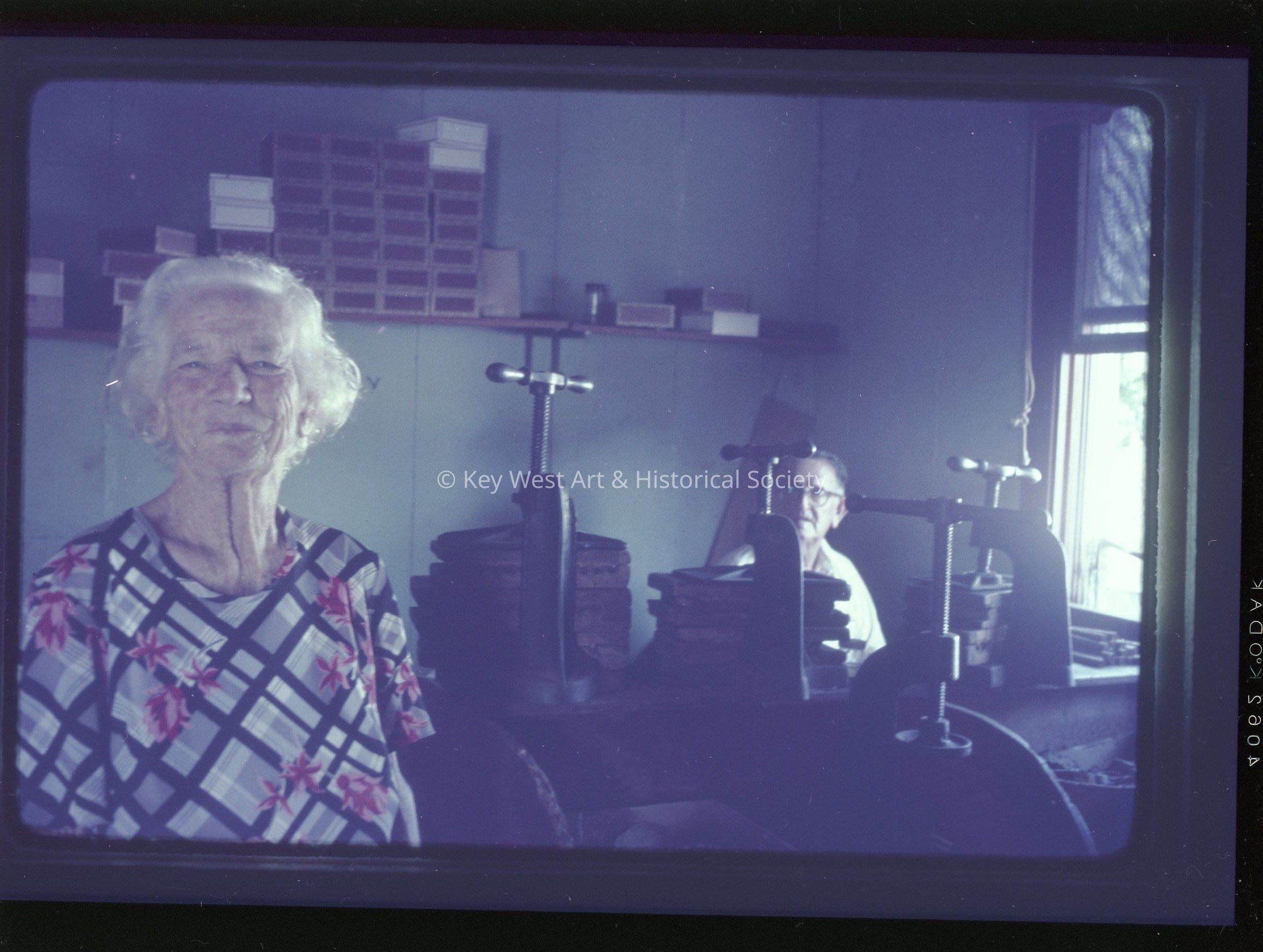 Color negative of Willard Bell and his wife Almead Bell inside The Tropical Cigar Factory. Almead is smiling in the foreground with Willard seated at a cigar rolling worktable in the background. The factory was formerly located at the corner of Fleming and Margaret streets.