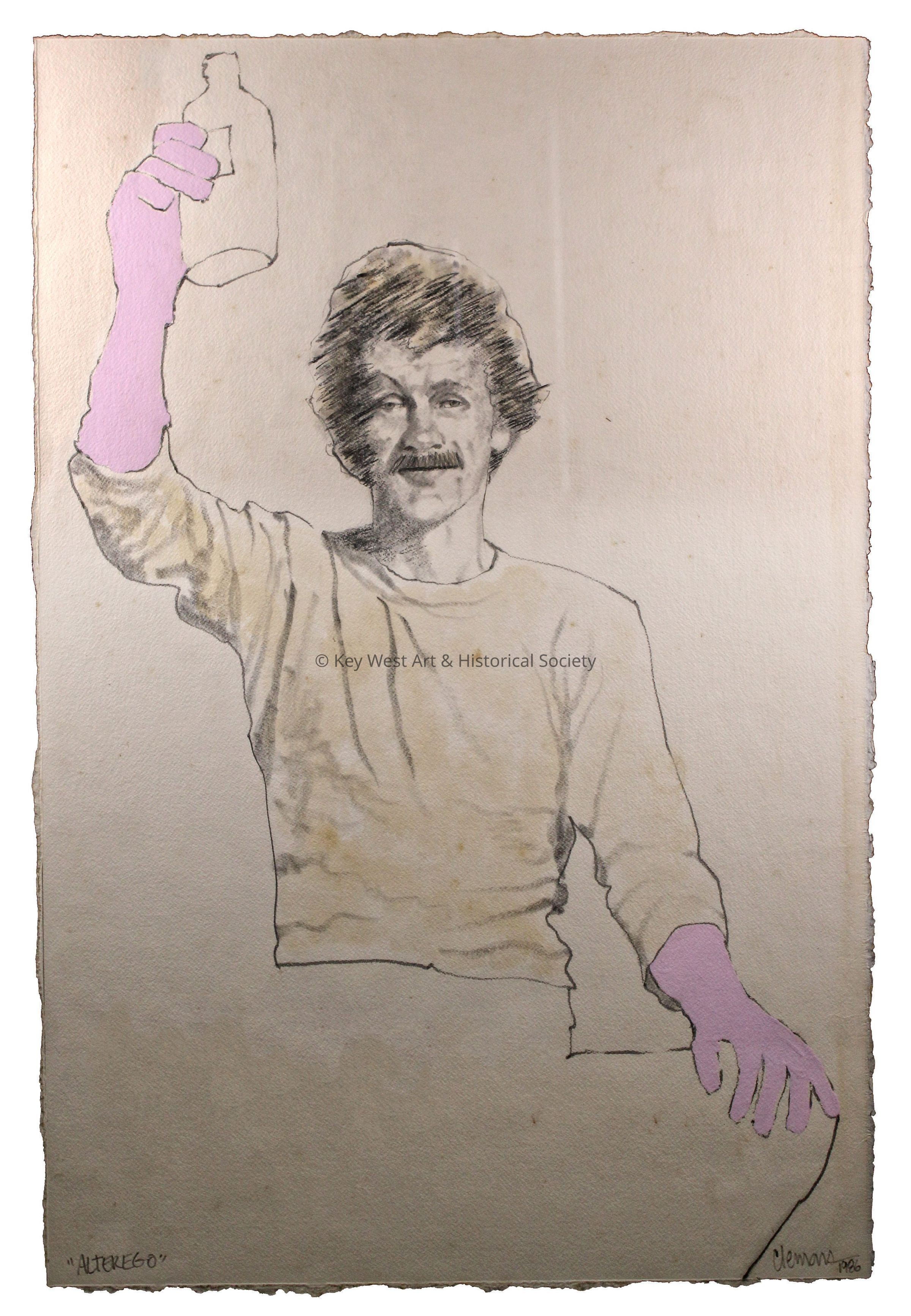 Pencil and acrylic self portrait drawing by Ron Clemons depicting the artist raising a bottle of spirits over his head.Type of Drawing
