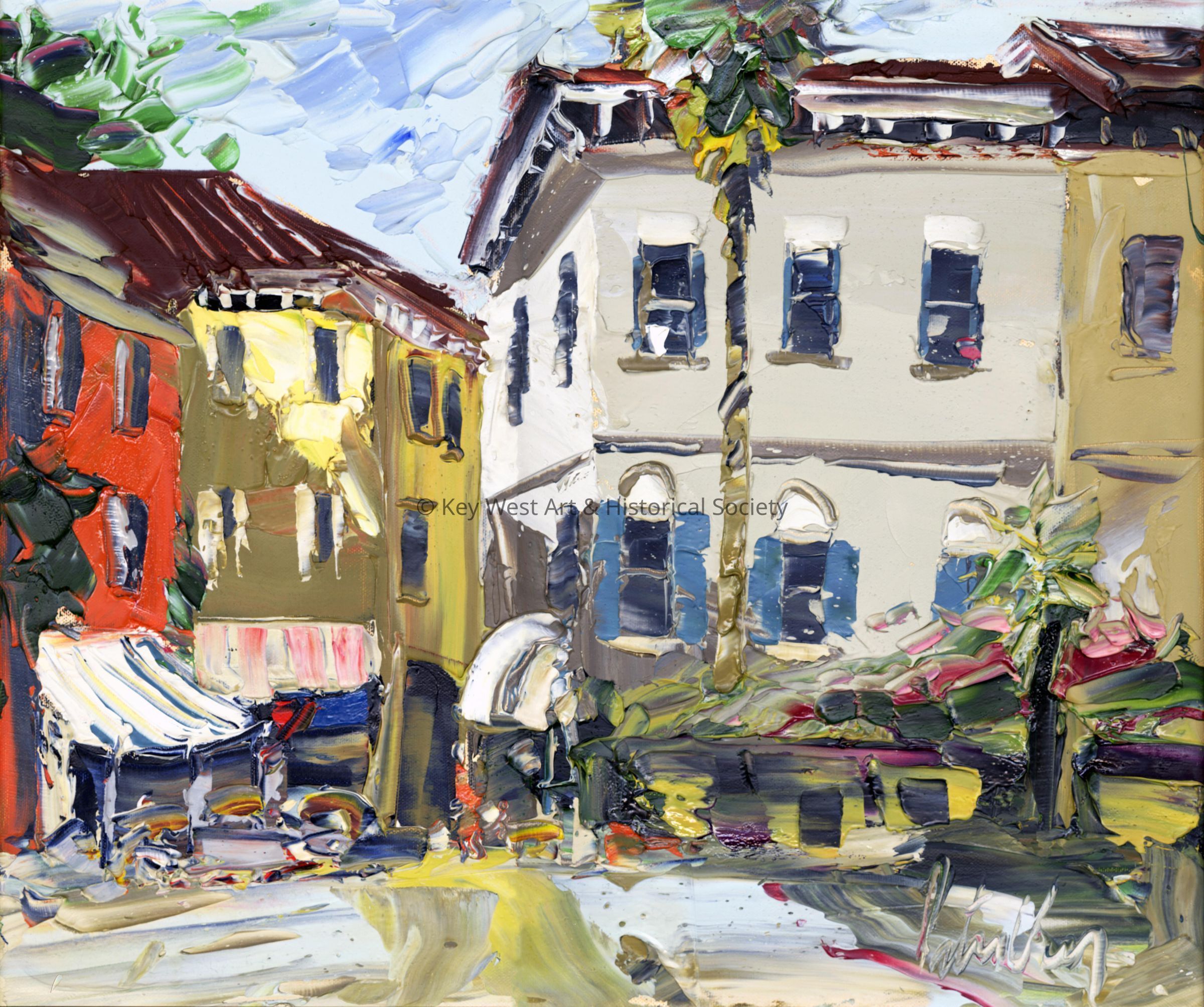 Oil on canvas painting by Peter Vey depicting a courtyard in Amalfi, Italy.Type of Painting
