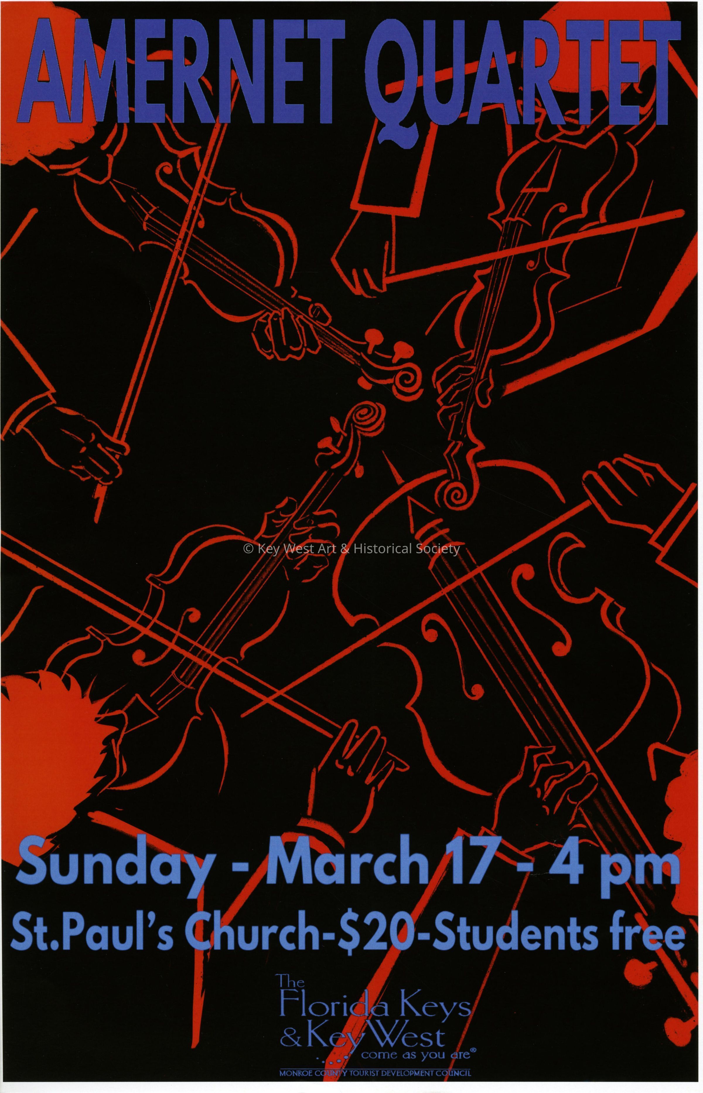An advertising poster for Impromptu Classical Concerts entitled 'Amernet String Quartet'. The concert took place on March 17, 2019 at St. Paul's Church, 401 Duval Street.Collection